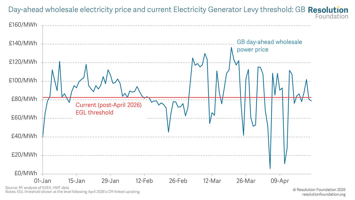 Net zero Cutting the cord Jonathan Marshall and Matthew Cavanagh dive into the details of the Government's plans to 'de-link' gas and electricity prices. 21 April 2026 by Jonathan Marshall Jonathan Marshall This post was originally published on our Substack. The news that the Government is planning to ‘de-link’ gas and electricity prices has been leading discussions on energy policy this week. But for those who, understandably, spend less time keeping up with the ins and outs of energy bills and the Government’s drive to net zero it might not have caused quite as much excitement. Here we dive into the details and explain what the Government’s proposals mean, what still needs to be tweaked, and what savings this might deliver to billpayers. What’s been announced? The Government’s plan to ‘de-link’ gas and electricity prices, faces up to one of the most-discussed issues in UK energy policy. The fact that the most expensive successful electricity generator (typically a gas power station) sets the price for all of the wholesale electricity market means that British households and firms are overpaying for electricity, and have been for some time. So, what is the suggested fix? The Government is proposing fixed price deals that older renewable and nuclear projects can sign up to, with the idea that this de-risks both us and – in theory – them from gas-driven price volatility. But this carrot for generators comes with a big stick as the Government has also announced an increase in the Electricity Generator Levy (EGL) rate from 45 per cent to 55 per cent and made it indefinite – effectively a threat to tax away profits created by high gas prices if generators don’t get on board with the new scheme. Add on Corporation Tax (from which EGL payments are not deductible) and we’re looking at a headline tax rate of 80 per cent on revenues deemed to be exceptional (assuming receipts pass through to taxable profits with no further deductible costs): a pretty spicy incentive to shift. A high tax rate, but will it bite? While the headline tax rate is set to increase, affected generators have benefitted from high inflation pushing up the threshold at which the EGL bites – from £75/MWh when first introduced in 2023 to close to £83/MWh today. But day-ahead wholesale electricity prices have been above this level for 70 per cent of days since the start of March (and 63 per cent since the start of the year). Further, they have only been above £90/MWh for 43 per cent of this period. It is likely then that the threshold at which the EGL is activated is too high and will not capture much of the excess profits made by generators. Further, as the threshold continues to increase by inflation each year, and if prices fall from current elevated levels (futures prices for this winter are around £75/MWh, at the time of writing) it risks being even further above the level needed to chivvy firms into doing what the Government wants of them. The high EGL threshold could reduce the impact of a higher tax rate The Government has also not closed exemptions that could limit the efficacy of a higher headline rate: small (<50 MW) generators remain exempt, and the £10m revenue threshold survives. This means that smaller projects (or smaller companies) will not be affected and will continue to pocket windfall revenues from higher gas prices. Combined, these factors mean that the tax change risks being underpowered. But it also shows where Government should be thinking about acting – reducing thresholds and broadening the tax base – if firms drag their heels on agreeing to ‘voluntary’ deals. Ministers need firms to respond to the threat of higher taxes The main reason for a change in the EGL rate is not to raise revenues, but to move some older generators onto Contracts for Difference (CfDs) that are now routinely used for new generation capacity. The value of these voluntary CfDs will be determined by an auction in 2027, representing another step towards electricity prices being a function of government decisions instead of a result of market forces. So, ministers will need to take care when setting auction parameters to ensure that resulting prices are as low as possible. Fundamentally, for the Government’s ‘de-linking’ to work, and for customers to benefit, it is vital that interest in the new CfDs is high. Shifting around 30 per cent of Britain’s power supply onto fixed price contracts is a big deal – far bigger than individual CfD auctions to held to-date. As such, ministers need competition to be as high as possible for prices to stay low. A well-designed allocation round that sees competition cut £20/MWh from clearing prices, for example, would be worth around £1.7 billion, or £16 per year to the typical household (on top of savings resulting from less exposure to the wholesale market when gas prices are high). A small upside but one that could prove important if other forms of downward price pressure don’t materialise. As well as enabling competition, the Government should avoid repeating recent mistakes that have increased CfD clearing prices for new capacity. For example, the Clean Industry Bonus allows renewable developers to claim a higher CfD price for delivering particular labour market outcomes; while these are certainly worthy, they would be better funded in a way that doesn’t push up electricity prices. Ministers instead should be laser-focused on low prices. A good step forward Stepping back from the detail, this week’s announcements are very positive news. Clawing back economic rents from within the electricity sector is long overdue, and setting out a system to prevent these being made at scale in the future is also welcome. There are some concerns about the strength of the ‘stick’ the Government has brandished, but simple changes can ensure that it is sufficient to deliver cheaper electricity to households from next year.