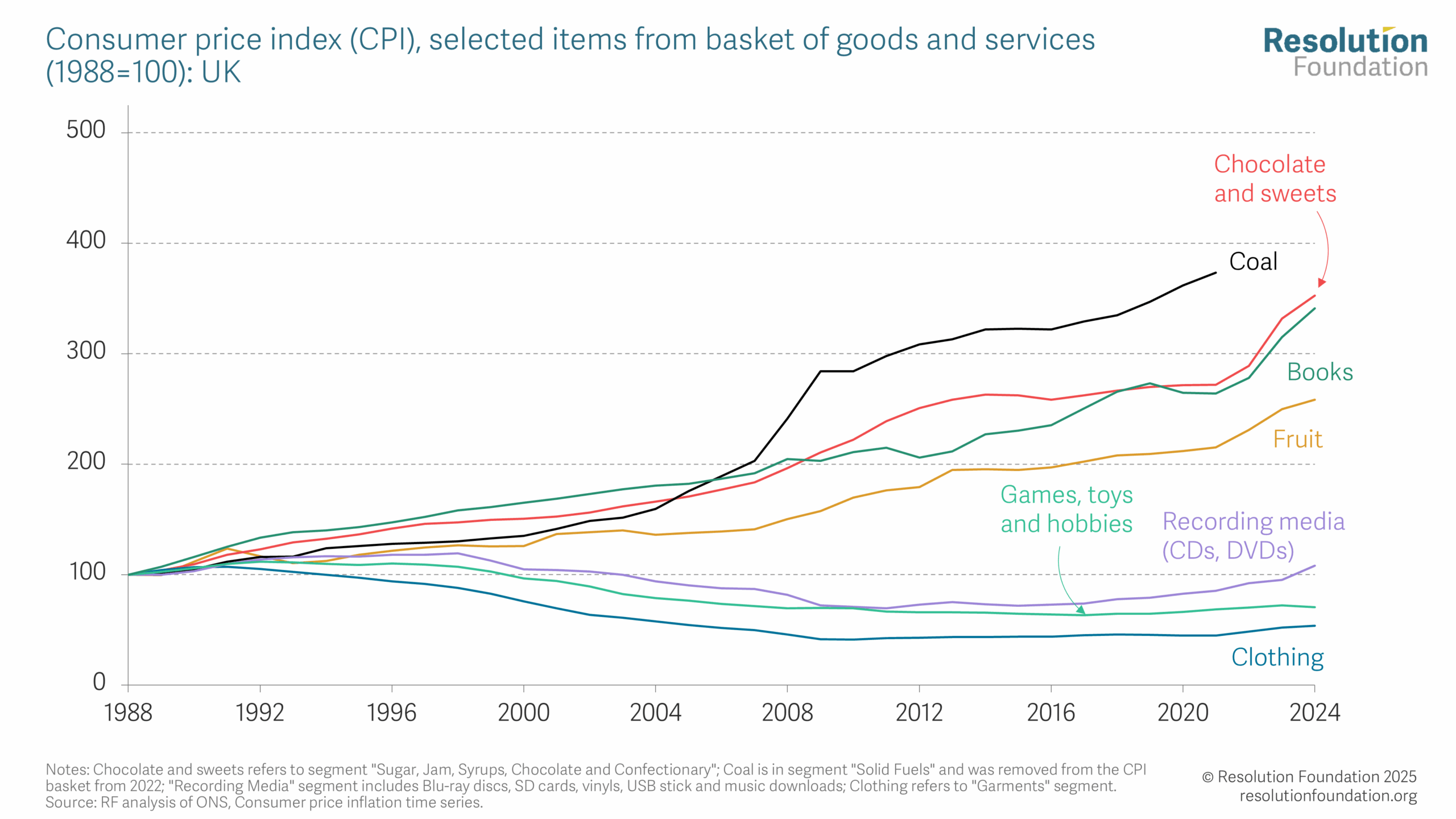 The professional preoccupation for political, policy, and economist types next week will be the cost of living, via the ONS prices data, while our personal preoccupation will be Christmas shopping. How should we think about these two seismic events? Fortunately, fresh from winning the innovation award at the recent  think-tank awards, we now bring you…the RF Christmas Stocking index! Here goes…It may be unfashionable in geopolitics right now, but global trade has helped consumers to stay fashionable on the cheap, with the price of clothes down 46 per cent relative to the late 1980s, while the China shock has fuelled a 29 per cent fall in the price of toys. Stocking up on socks, PJs and Italian brain rot will save a few pennies this crimbo. Less good news for sweet-toothed intellectuals in your life – sweets and books have more doubled in price over the past 35 years. And, finally, naughty children beware – you are literally paying a heavy price for your antics this year. That piece of coal you’ve ‘earned’ has almost trebled in price, crowding out spending on all fun things you really want.