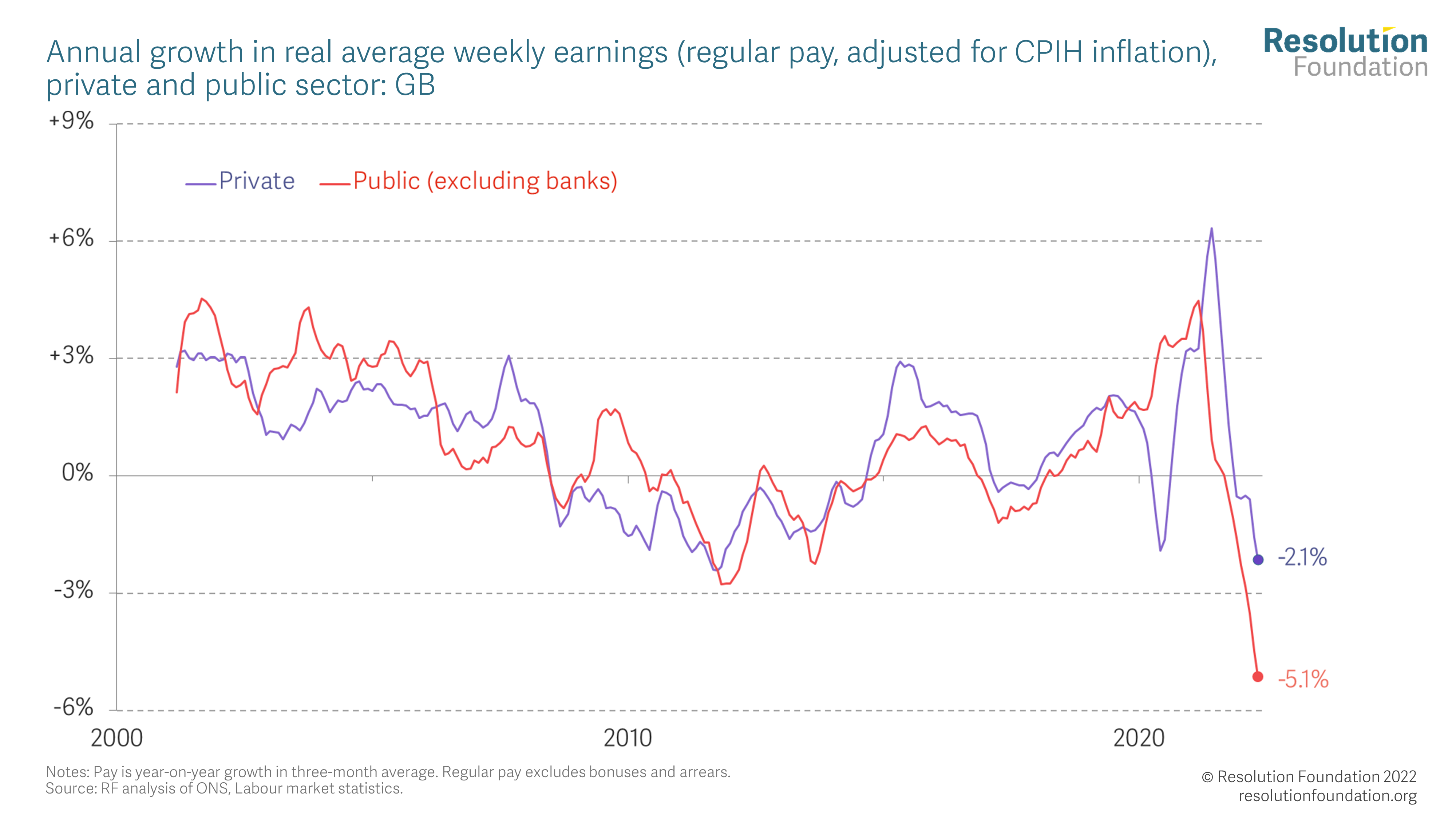 Labour market Feeling poor and working more – again 19 July 2022 by Greg Thwaites Greg Thwaites Today’s labour market data tell us a bit more about how the labour market is responding to high inflation and the cost of living shock. We see some things we would expect, some things which may be surprising, and much that remains unresolved. Real wages fall at the fastest rate on record The most eye-popping statistic in today’s labour market data is also the one that is easiest to explain. Real regular pay fell by 2.8 per cent in the three months to May – the biggest fall since this measure was first recorded in 2001, and almost certainly for much longer – perhaps as much as 45 years. This is the simple consequence of unexceptional 4.3 per cent growth of nominal wages and very high CPIH inflation of 7.3 per cent. As price inflation accelerates, this measure of real pay is likely to continue to fall in annual terms for many months to come. Worse still, pay growth is weakest at the bottom end of the labour market. HMRC’s data suggests annual growth in monthly pay in May was 1.3 per cent at the 10th percentile and 6.9 per cent at the 90th percentile (and even higher – 9.1 per cent – at the 99th percentile). This means that only the very highest earners are seeing above-inflation pay growth. Everyone else is experiencing a real pay squeeze – and particularly the lowest earners. Real pay growth at the 10th percentile stood at an eye watering -6.0 per cent in May. It’s worth noting that the movement of some self-employed workers into employee jobs, which has been concentrated among those in higher paid jobs, may have pushed up pay growth at the higher end of the payroll distribution. But this doesn’t explain why pay growth is so weak for the lowest earners. A second area of concern is the public sector, where pay growth is much slower than in the private sector. Nominal pay growth in the public sector has been trending downwards (regular pay growth reached 1.8 per cent in the three months to May), in contrast to pay growth in the private sector which has been strengthening (regular pay growth was 5.0 per cent in the three months to May, up from 4.2 per cent at the start of the year). This means the real pay squeeze is much deeper in the public sector. Real annual pay growth in the public sector (after adjusting for CPIH inflation) was -5.1 per cent in May, compared to -2.1 per cent in the private sector. Look out for the announcement, expected today, of the Government’s pay settlement for around half of public sector workers. Workers are coming back in to the labour force When real wages fall, labour supply can go up or down. It goes down if workers decide that working is no longer worth their while (a substitution effect). Or it goes up if workers decide they need to work more to maintain their standard of living, even if they get less for each extra hour (an income effect). Labour force participation rose sharply during the 2010s, again alongside weak real wages, as workers felt poor and worked more, consistent with the latter income effect dominating. But then participation fell back a great deal during the pandemic, more than in most other countries, driven by students and the long-term sick, by the over-50s, and offset by falls in non-participation among those looking after home and family. Overall, inactivity rose by about 500,000 among the working-age population. The latest data, which show participation rising in the face of very weak real wages, look like an extreme version of the 2010s. Over the past three months we have seen a partial reversal of this, with inactivity falling by about 225,000, driven by both students and older workers. This is good news for the public finances and the wider economy as these extra workers pay tax and gain skills, although rising student numbers can also be good for the economy in the long term. Labour demand remains strong – but for how long? These extra workers hitting the labour market are finding jobs. The employment rate continued to increase, while the unemployment rate ticked down in the monthly and three-monthly data. The RTI data show inflows into employment of 739,000 in June – close to the record highs set in Spring 2021 and way higher than the average of 549,000 in 2019. There are plenty of vacancies for workers to fill – some 1.29 million in Q2 – roughly the same as the number of unemployed people (which is the optimal number according to a recent paper). The growth in vacancies has slowed, however, and there are signs in the monthly and Adzuna data that the number of vacancies may now be starting to fall. This softening in vacancies could be for different reasons. Maybe labour demand remains strong, and the vacancies are getting filled as employment rises. Or maybe labour demand is starting to weaken, as the cost of living crisis, driven by expensive imported food and fuel, leaves households with less money to spend on UK goods, and hence UK firms with less need for labour. Consistent with this, in 20 years we’ve never seen consumer confidence fall as much as it recently has without a subsequent rise in unemployment. Nominal wage growth may be too high for the Bank The balance of labour demand and labour supply will ultimately determine wage inflation, a key driver of inflation in the medium term, as the Bank of England keeps telling us. Total nominal pay grew by 6.2 per cent in the 3 months to May, and 7.2 per cent in the private sector – the strongest non-pandemic rate since February 2007. The big wedge between regular and total pay represents bonuses. It’s not clear which of these different measures is the most relevant for the marginal cost of production, and hence for inflation – bonuses to recruit and retain staff might well be considered marginal costs, while those paid for past good performance might not be. In this context, it is reassuring that the BICS data suggest that wages are not a major 