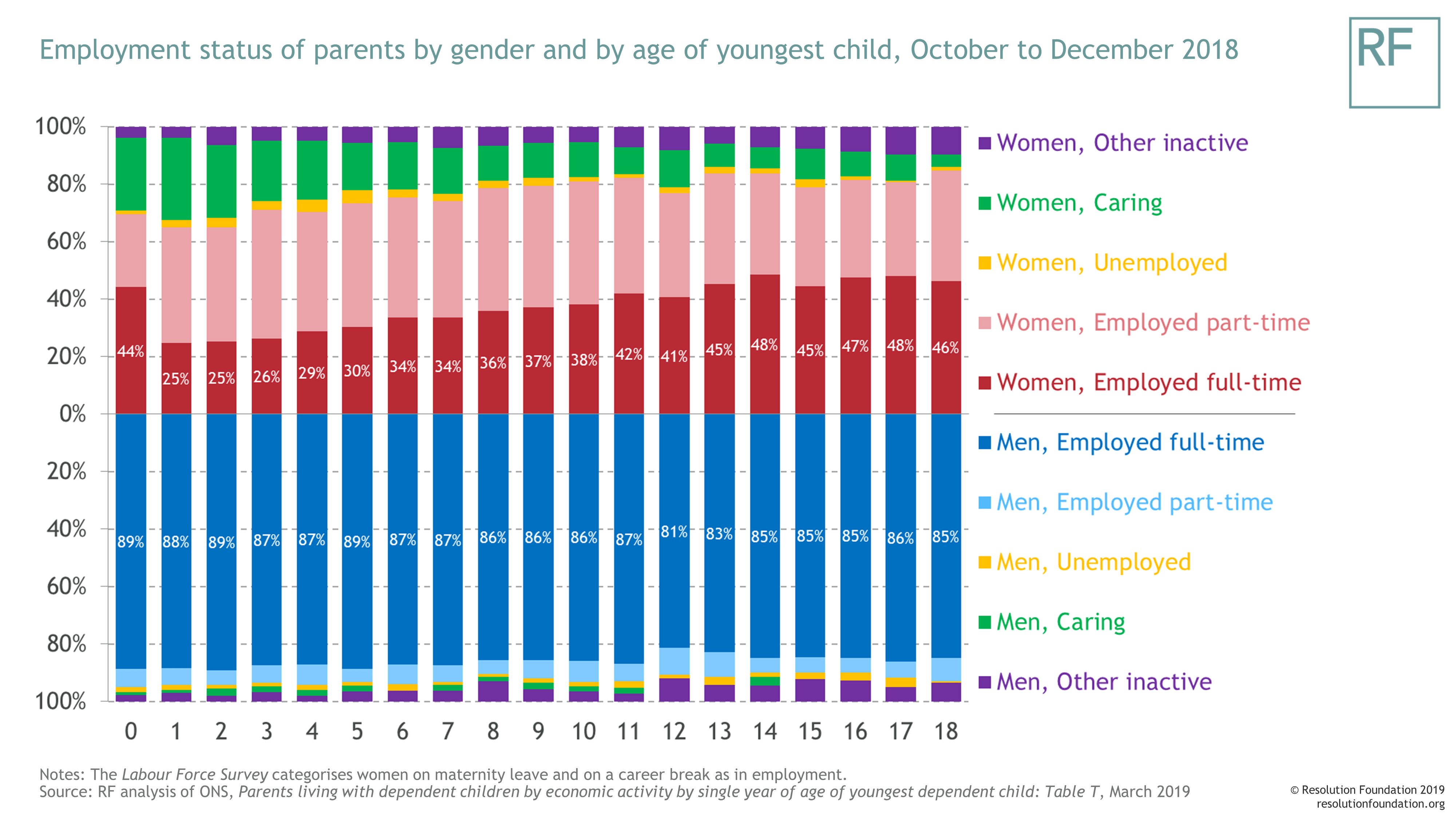 Labour market· Childcare· Welfare How big is the gender parenting gap, and is it improving? 8 March 2019 by Adam Corlett Adam Corlett A lot has been written about the gender pay gap, with the typical hourly pay of women in full-time work 9 per cent below that of men – down from 17 per cent two decades ago. But there is another gap lying behind the gender pay gap that gets far less attention, despite being just as important. That is the gender parenting gap, or corresponding gender work gap. In this blog we put a number on the share of the employment hit borne by mums and dads as a result of looking after children. Does the reality match up to perceptions of rapid cultural change in this area? Large gender differences clearly remain in overall employment rates. Despite rapid progress in female employment, only around 78 per cent of women age 25-34 are employed, compared to 90 per cent of men. Women are also far less likely to work full-time than men. Although parenting is not the sole reason for this, it is a huge part of the story. As the chart below shows, among families with a child aged two, 89 per cent of fathers are in full-time work while only 25 per cent of mothers are. This matters for the gender pay gap – even measured on an hourly rather than weekly basis. As shown below, gender differences in hourly pay are relatively small among younger workers, before childbirth, but part-time work – or time out of the workforce – after having children too often means missing out on wage progression. This results in large gaps opening up between typical male and female workers, with knock-on effects for pensions too. As well as impacting on in-work progression, the imbalance in employment between men and women also more directly means a gender imbalance in financial power and national leadership as more women are missing from the workforce. The world of work misses out on their contributions and experience too. And perceptions of how (relatively) likely men and women of a certain age are to need parental leave, part-time work or to leave the workforce as a result of having children, of course play a role in discrimination by employers. So the share of parenting done by women and men is something we should all care about. And the graph below gives a new indicator of how this has changed over time. Using the Labour Force Survey, we look at the gender split of parents who are: Not working due to looking after family; Working part-time but do not want a full-time job; or Employed but working fewer hours due to maternity/paternity/parental leave. Concentrating on families with a child under five, 93 per cent of parents making some kind of employment sacrifice were female in 2018, down from 98 per cent in 1992-93. Conversely, men’s share of this employment hit has risen from around 2 per cent to 7 per cent. The female share is slightly lower (92 per cent) for part-time working, and slightly higher (94 per cent) for being out of the workforce entirely, but both categories display very similar trends. Trends are also very similar for those with older children. These figures account both for divisions within couples as well as the overwhelming gender divide of lone parents. This is a significant social change, with the male share having more than quadrupled. Public policy has played some role in this – including the end of joint taxation for couples in the 1990s, the rapid expansion of state-subsidised childcare, the introduction of (limited) paid paternity leave in 2003, and (limited) shared parental leave from 2015. However, we shouldn’t get ahead of ourselves on the scale of this change. If the overall trend of the last 26 years were to continue it would take until the 2220s to reach gender parity on this measure. Views may differ on whether complete balance should be the goal, and on the relative roles of the state, employers and individuals. But there is potentially much more policy could do. To start with, financial disincentives for mothers to work could be reduced by scrapping the marriage tax allowance, introducing a second earner work allowance into Universal Credit, and providing further help with childcare. But parental leave and pay are likely the most important policies for the gender parenting gap, with couples’ later decisions about the division of parenting and employment strongly affected by their child’s first year or two. When the law offers mothers six weeks of leave at 90 per cent of salary (uncapped), and 33 weeks on a low income, but only offers fathers two weeks (albeit with the option of using some of the mother’s weeks) on that insufficient income, we shouldn’t be surprised that there is a large gender gap in employment and early years parenting. Given this – and that an overwhelming majority of under 40s support increasing paid paternity leave – perhaps we should look to our Nordic neighbours. In Iceland, mothers get three months of generously-paid leave, fathers get the same (also non-transferable, importantly), and couples get a further three months to share between them. Or Spain, where paid paternity leave is in the process of being increased to 16 weeks to reach gender parity. And we should also look to companies such as Aviva that have introduced the same paid leave policy for fathers as for mothers. Individual attitudes matter too, and social norms are perhaps harder to change than policy, but improving the gender balance of both government and corporate parental policy should be something that both men and women can get behind. Substantial progress has been made over recent decades on the gender pay gap and female employment. But the indicator above – which we will revisit in future – clearly shows there is a lot more to be done. We shouldn’t have to wait till the 2220s for real gender equality.