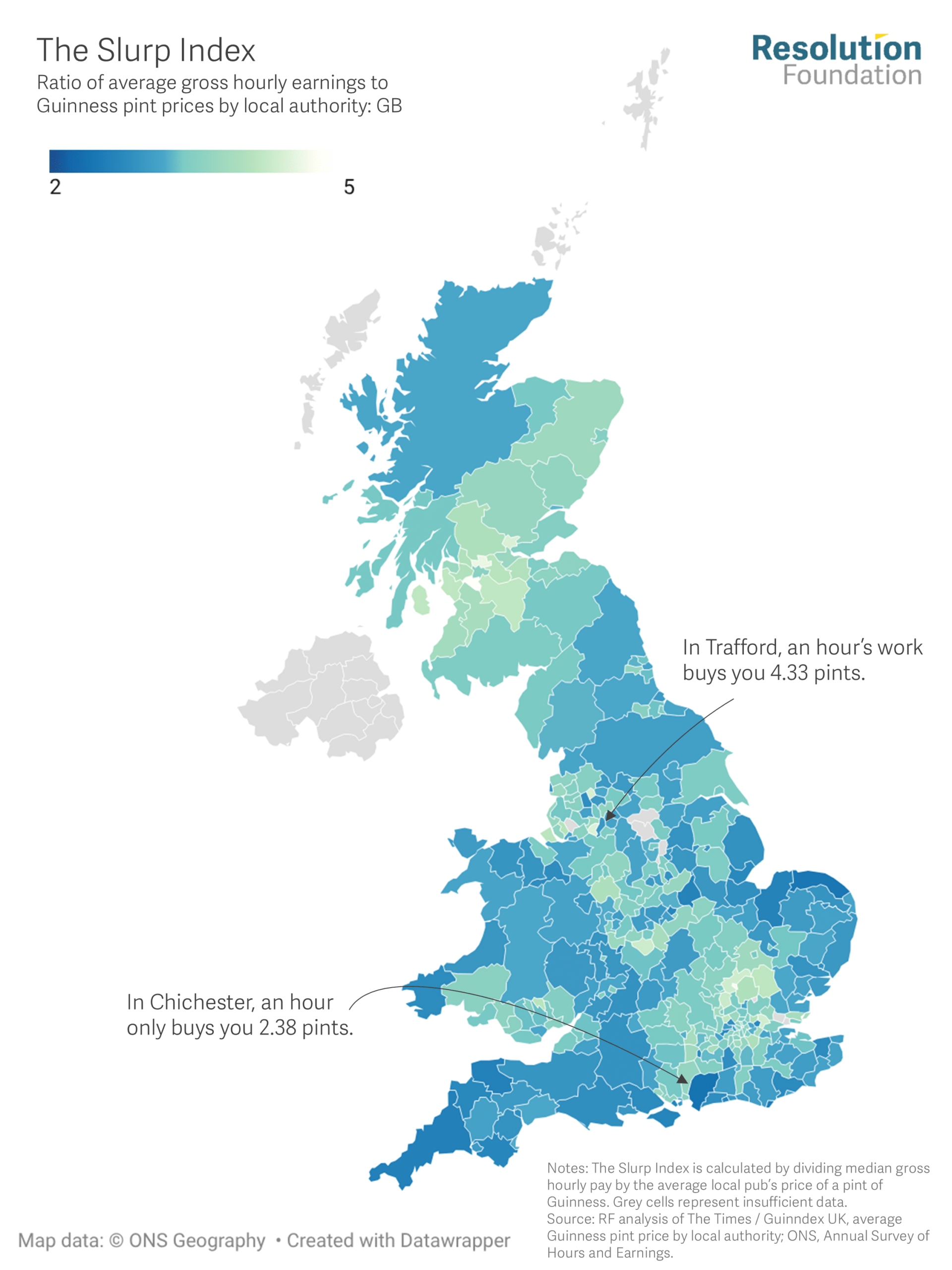 How many pints does an hour’s work buy you? Top of the charts 24 April 2026 Ruth Curtice Morning all, Amidst… war, plotting and scandal a bumper week of economic data, there were once again (*sticks fingers in ears and pretends war isn’t happening*) nuggets of good news. I wouldn’t be surprised if you missed the latest data on private rent inflation. Happily, it’s not surging in advance of the Renter’s Rights Act with inflation on new lets at 1.8%. Not so happily, the cash freeze on how much those on UC can be paid for housing costs is continuing to squeeze low-income families. You might have spotted the puzzlingly strong PMI data, but if you aren’t already glued to our Substack (your loss), don’t miss Simon’s piece unpacking this conundrum. But for those focused on the data that really matters scroll on for our very own Slurp Index, unpacking the price of pints, for Chart of the week. Have a great weekend, Ruth Chief Executive Resolution Foundation Village people. When Athens built its 2004 Olympic Village it did something unusual: from the start, the €300 million, 2,300-unit complex – with landscaped parks, new schools and a health clinic – was designed to become social housing once the athletes left. Some 18,000 working families applied, and 2,000 were picked by open lottery. This (doric) column looks at secondary-school kids who moved versus those who lost the draw, and find movers’ grades rose by 0.24 standard deviations, vaulting a median student to the 59th percentile, and that the gains cluster among previously low-achieving teenagers. Some lessons for Manchester 2036? Entry denied. Has AI started eating entry-level jobs or is the jittery hiring data just tighter monetary policy in a trenchcoat and a fake moustache? A new paper exploits a neat quirk to separate the two: Sweden’s Riksbank started raising interest rates in April 2022, a full seven months before ChatGPT launched, giving a clean window to tell the stories apart. Combing through 4.6 million job ads and the full population register, they find the broad collapse in vacancies since then tracks the rate hike, not the chatbot, but that employment of 22-25 year-olds in the most AI-exposed occupations has fallen by 5.5 per cent relative to their less-exposed and older colleagues. One caveat: October 2022 also saw the launch of a new employment protection law in Sweden, which might have scrambled up the hiring data. Just when you thought you’d found an exogenous shock… Side hustle. Most of what we know about insecure work comes from headline employment statistics that count one job per person. A new report from the Women’s Budget Group (who I have a feeling we will be seeing more great stuff from having met their brilliant new CEO Dr Daniella Jenkins this week) argues that this has been quietly hiding the shape of young women’s working lives. The authors find that one-in-ten women aged 16-29 were juggling more than one job simultaneously in 2023-24, compared to one-in-fifteen young men. Hospitality is where the pattern is most concentrated: 18 per cent of young women with multiple jobs work in the sector, many of whom miss out on pension auto-enrolment due to earning under the £10,000 threshold. Predictably, the drivers are low wages, insufficient hours, and an abundance of temporary contracts. Flexibility for the employers, jigsaw puzzles for employees. Baby fever. Policymakers worldwide (including at RF towers) are grappling with why fertility is on such a downward slide, and the mooted economic and cultural causes are endless. This paper adds a neurobiological view and argues that being around babies simply makes people want babies. Their “empathy channel” works like this: exposure to infants in your social environment triggers a brain response that raises your desire to have kids. But as fertility declines and infants become rarer in daily life, that stimulus weakens too, amplifying the original decline in a self-reinforcing loop that they estimate could explain 13 per cent of the birthrate fall. Out of sight, out of mind. Something for the weekend | Stick or twist What a difference a war makes. Back then few people knew where the Strait of Hormuz was, and markets were pricing in two interest rate cuts this year. Now? Thursday’s MPC decision will face the question of whether rates ought to be heading the other way entirely. The Bank is widely expected to ‘stick’ for now. But how quickly to ‘twist’ – raise rates to limit the inflationary effect of the latest global energy shock – is a question which divides reasonable minds. Catch up on our great discussion earlier this week for a deep dive on what’s at play. One position points to patience. The latest stats confirmed that the labour market remains loose, leaving us better placed than in 2022 to avoid second round effects (where firms fund wage rises by passing costs on to prices). Dodging a wage-price spiral would be welcome – though it’s cold comfort for workers, whose real wages grew by just 0.2 per cent in the year to February. Pulling the other way is the uncomfortable truth that living through high inflation leaves a lifelong mark. With only one of the last five years seeing below-target inflation, the risk is the memory of an inflationary shock leaves expectations (what central bankers really care about) less well anchored. Next week, economists and markets expect the Bank to hold at 3.75 per cent. Where rates go from there – and how fast – is still to play for. Chart of the week As beer garden season approaches, you may have seen a new Guinness Index of average pint prices across Britain featured in The Times this week. We decided to give it the RF treatment and considered not just the cost of a pint of the black stuff, but how that compared with average hourly earnings in each area. You can see the results below – darker areas represent places where an hour’s work will buy you fewer pints. Traffo