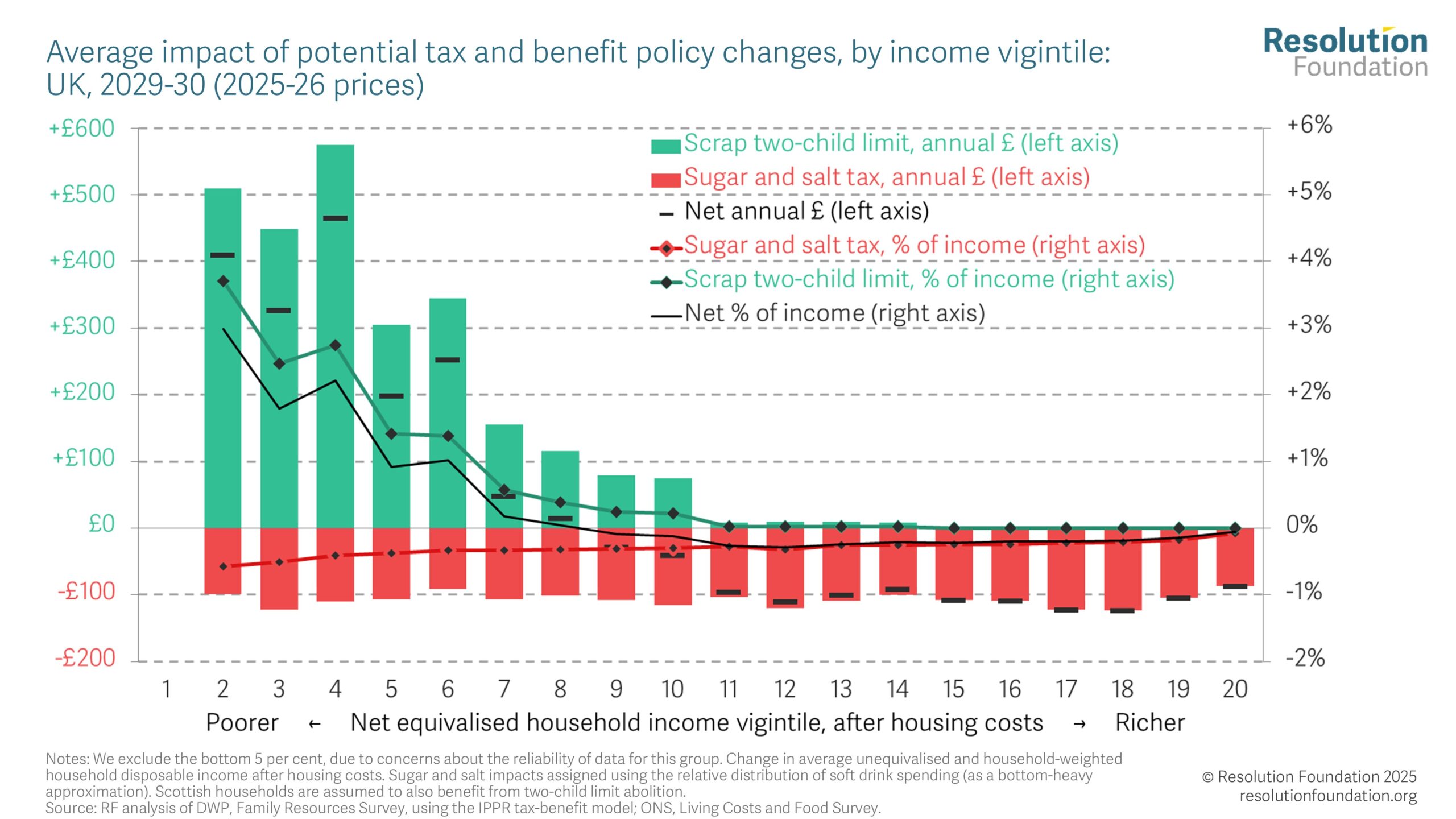 Pricey peaks and cakey cutbacks Top of the charts 17 October 2025 Ruth Curtice Morning all, Let’s start with a wonkhack tip – if you’re going to be grilled at the Treasury Select Committee, I highly recommend bringing a phone a friend panel as strong as the one that accompanied me on Tuesday. We spent the first half discussing the need to simplify and reform the tax system to boost growth with MPs rightly probing on why reform can prove so hard. Right in my zone. In the second half much time was dedicated to considering whether changes to agriculture property relief in inheritance tax were a threat to UK food security…. Below, we look ahead to next week’s inflation numbers. Plus, Chart of the week models the distributional impact of ‘paying for’ the abolition of the two-child limit with a tax on unhealthy foods. Make sure to sign up for our interesting discussion next week on the growing number of young people neither earning, nor learning. Myths will be busted, and solutions crafted… Have a great weekend, Ruth Chief Executive Resolution Foundation Birthday beef. Ever forgotten a colleague’s birthday? Your slip-up may have economic ramifications. New research, based on a non-specified national retail chain, tested the consequences of failing to deliver a timely birthday gift when one is expected. The oversight causes a > 50 per cent increase in employee absence due to sickness, and a two-hour drop in monthly hours. These effects are substantial and immediate despite the mild nature of the mistreatment. The effect is stronger for middle-managers – maybe because they expect a better relationship with their bosses. Happily, performance bounces back if a belated gift arrives, suggesting the relationship can be repaired. Even so, the costs can mount quickly for firms. The retail chain in question faced $129,600 in annual losses from the increased sick days alone. Maybe it’s time to refresh your birthday calendar holds. Sizing up the prize. Last week’s Nobel Prize for Economics went to Joel Mokyr, Philippe Aghion and Peter Howitt for explaining how we got rich – or “innovation-driven economic growth”. Mokyr identified how technological progress drives sustained growth, whilst Aghion and Howitt developed the theory of growth through creative destruction. Mokyr argued that modern growth was rooted not in material factors but in ideas. Specifically, the connection between propositional knowledge (understanding why things work) and prescriptive knowledge (knowing how to make them work). This feedback loop between using your head and your hands sustained self-generating progress. Aghion and Howitt, meanwhile, created a model that showed how aggregate growth stays smooth despite violent micro-level disruption. Innovations arrive randomly across sectors, generating churn at firm-level but averaging out to steady progress. For Brits, enduring nearly two decades of anaemic growth and stagnant living standards, any theoretical advances that translate into boosting productivity would be most welcome. Hopefully we can turn this propositional knowledge on growth into prescriptive knowledge fast… The original bitcoin. Those clever folks over at the Bank Underground have done a great historical look at the original currency disruptor – paper money. First introduced in 1694, the driving factor for shifting to paper notes was feared shortages of coins during wartime. It was in 1797 – fearing French invasion – that notes were first issued with the aim of replacing coins for everyday transactions. During the First World War, the Government renewed action to convert coins into paper to boost bullion reserves and pay for US imports in gold. This worked partly because wartime patriotism made people more amenable to the change, and partly because the Government built trust by ensuring parity between coin and paper and investing in measures to prevent forgery. For those who still love a (proper solid) coin though I highly recommend the patriotic act of visiting the Royal Mint. Getting good grades. Turns out, teachers grade girls higher in subjective assessments. These researchers analysed A-level results from the 140,000 state school students who were graded by teachers instead of exams during the pandemic. There were statistically significant gender *and* socio-economic biases. Girls were, on average, 4 per cent more likely to be just above a grade boundary than below it, while students on free school meals were 13 per cent less likely than their peers to fall above a grade boundary. Notably, biases were lower in maths and sciences, where teachers had more information on prior achievements. Subjects with higher levels of discretion in grading, like Art and English, saw greater biases. My takeaway? Standardised testing reduces grade bias. Long live exams! Something for the weekend | Persistent price pressures This week, the IMF’s World Economic Outlook forecast UK inflation would average 3.4 per cent in 2025, the highest in the G7. Next Wednesday the ONS publishes September’s inflation figures, and they matter for three reasons. First, the Bank expects CPI inflation to peak at 4.0 per cent in September – likely the high-water mark for 2025. Gilt markets have had a good end to the week but we will be watching closely with sticky inflation a key reason for the UK’s high borrowing costs. Second, the key component of recent inflation rises has been the reacceleration of food price inflation, hitting those on low incomes hardest. This comes as food prices are already nearly 40 per cent higher than in summer 2021. Third, September’s inflation figure will be used to uprate benefits come April. These rose a paltry 1.7 per cent in April 2025 (based on September 2024’s CPI). But, if the Bank is right about September’s figure being 4 per cent, then the standard allowance in Universal Credit is set to rise even more than that next April – most likely 6.4 per cent, which would