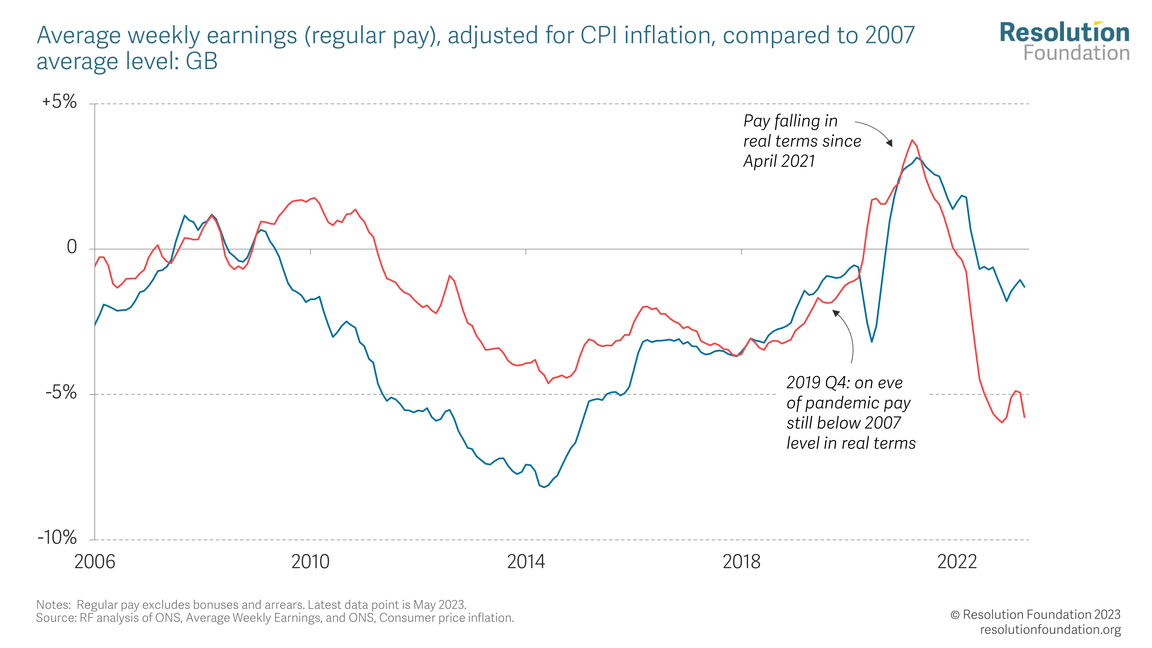 Labour Market Outlook· Labour market Real-term public sector pay falls are fuelling the recent strikes… but what lies ahead? 15 August 2023 by Nye Cominetti Nye Cominetti Across the past year, 3.9 million working days have been lost to industrial action– more days than at any point since the 1980s. The Resolution Foundation’s Labour Market Outlook, published today, takes a look at why these strikes are happening… and, crucially, at what’s happening to public sector pay, and how this has fuelled the ongoing strike action. Firstly, to put things into context, it’s worth making it clear how the recently elevated levels of industrial action fit in with the historical picture. Compared to the 1970s/80s, we’re hardly seeing any strikes: many years in those decades had eight to nine times more days lost to strike action than we’re seeing now, with this partly due to the fact that about twice as many workers were in a union then. That said, in the modern era of lower union membership (22 per cent of workers were in a union in 2022, compared to 39 per cent in 1989), 3.9 million days in a year is a lot: it’s about nine times more than the average yearly number in the 2010s (450,000). So what’s driving the strikes? The answer is that strikes are happening firstly in sectors in which unions are still strong, and, secondly, in sectors where the pay pain has been happening. Recent industrial action has overwhelmingly been concentrated among sectors that are unionised: mainly the public sector (health, education and public administration), and the postal services and railways, both of which used to be part of the public sector. And while high inflation meant that average weekly pay for all workers fell in the past two years, the hit has been especially severe for public sector workers, who have seen real-terms pay falls of 9.2 per cent over this period (compared to a fall of 2.9 per cent in the private sector). It’s worth noting, however, that the (broad) industry that has done worst in pay terms over the past two years is actually ‘personal services’, which part of the private sector. But because union membership in this sector is low, it has seen almost no strike action at all. It’s also worth noting that the strikes haven’t just been sparked by the recent cost of living crisis. The context of the last 10 years matters too: during this period, we’ve seen public sector pay losing ground relative to private sector pay, as the chart below shows. We’ve also seen an increase in job-related exhaustion and stress in the public sector, with data from the Skills and Employment Survey showing that, in 2017 (the most recent data available), the proportion of public sector workers who said they were were always or often ‘coming home exhausted’ stood at 57 per cent (although 48 per cent of private sector workers also reported feeling this way, pointing to wider problems with job quality and working conditions across the UK). The recent pay squeeze in the public sector also appears to have contributed to a larger relative increase in vacancies in the public sector: while the vacancy rate is normally higher in the private sector, vacancy rates are now equal after a faster increase in public sector vacancies post-Covid. This acts as a reminder that, in the long run, pay and conditions in the public sector can’t drift too far apart from those in the private sector – if they do, then it becomes increasing difficult for the public sector to attract workers. Looking forwards, we have likely passed the high watermark of strike action, with education unions accepting the Government’s recent 6.5 per cent offer, and pay looking likely to start growing again in real terms later this year.