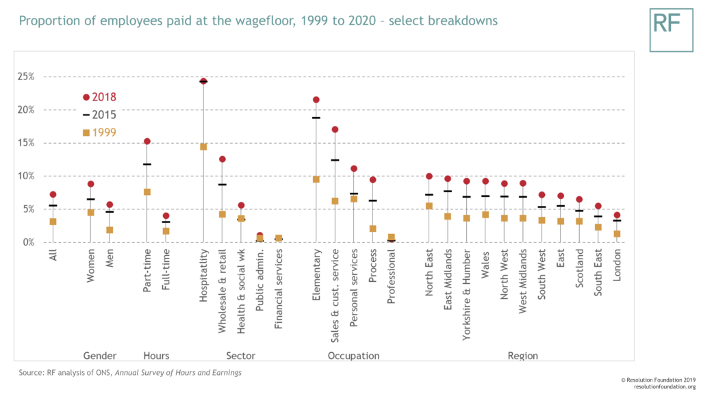 Labour market· Low pay· Pay The minimum wage: now the only question is ‘how high?’ 30 March 2019 by Nye Cominetti Nye Cominetti This Monday, the 1st April, 2 million people working minimum-wage jobs will start the week with a pay rise. The National Living Wage (NLW), the rate that applies to 25+ year olds, will rise by 38p, from £7.83 to £8.21. We project that this will increase the number of people paid at the wage floor to 2.7 million workers. In this article we chart the increasing reach of the minimum wage, and its impact on hourly wages at the bottom since its introduction in 1999. First, who are the minimum wage employees? In 2019, 1.7 million are women (62 per cent of the total), and 1.6 million are working part-time (60 per cent of the total). Of course, there is significant overlap here – women working part time comprised more than two-in-five (43 per cent) of all minimum-wage workers in 2019. Minimum wage workers are also predominantly in the private sector (2.4 million in 2019 – 87 per cent of the total) and in three sectors in particular. In 2019, hospitality, wholesale and retail, and health and social Care together contain 3three-in-five minimum wage workers (58 per cent of the total). On Monday the NLW enters its fourth year. The NLW is rising in value so that by October 2020 it will be equal to 60 per cent of median earnings (for those aged 25+), whereas in April 2015 it was worth 52 per cent. These increases are serving to extend the reach of the wage floor. In 2020, in just five years, the NLW will have doubled the proportion of employees paid the minimum from 6 per cent (representing 1.5 million workers) to 12 per cent (3.3 million workers). The chart above shows the reach of the minimum wage across sub-groups of employees. It compares the coverage in 2015 (pre-NLW) with our projection of the reach in 2019 and 2020. Since Monday also marks the twentieth anniversary of the minimum wage’s introduction in the UK, we also look back to 1999. Perhaps most startling is the impact the minimum wage is now having in the three largest low-paying sectors (those mentioned above). By 2020, one-in-three workers in hospitality will be paid the minimum wage. The policy is having a dramatic effect in that sector. In others, such as the public sector and finance, where pay is higher, the minimum wage has barely had any effect at all, and even the recent rises aren’t changing that. The point of the minimum wage, of course, is to increase the wages of the lowest paid. The chart below shows that this goal has been achieved. Over the last twenty years, hourly pay growth has been strongest at the bottom of the distribution. The period after the policy’s introduction (1999 to 2003), is particularly striking, as is the impact of the recent NLW increases, with strong hourly wage growth for lower earners in the last three years. Monday’s uplift will see the NLW increase by 4.9 per cent, well above the current growth in average pay (in January the annual growth in average nominal weekly earnings was 3.4 per cent). The debate has now turned to post-2020, with the Chancellor mooting an even more radical policy of ‘ending low pay’, which, based on the most widely used definition, would mean the minimum wage being set at 66 per cent of median earnings. This 66 per cent ‘bite’ would represent a leap into the unknown. Arin Dube’s review of minimum wages will help, but he will have scant international evidence to draw on for such a high bite. Of rich countries only France’s bite is comparable, and that’s only 62 per cent. What’s more, the differences between the two countries will make it hard to learn lessons directly. For example, in France most jobs are covered by collective bargaining arrangements, and there are extensive subsidies for employers hiring the low skilled and the young. Still – the Chancellor’s ambition is laudable, and a far cry from back in 1999 when the Conservatives opposed the minum wage’s introduction. Today’s political consensus on the minimum wage is highly welcome. On its twentieth birthday, it is pleasing to reflect on how far the minimum wage has come. Where once it was seen as a job-killer, now the only question is ‘how high?’.