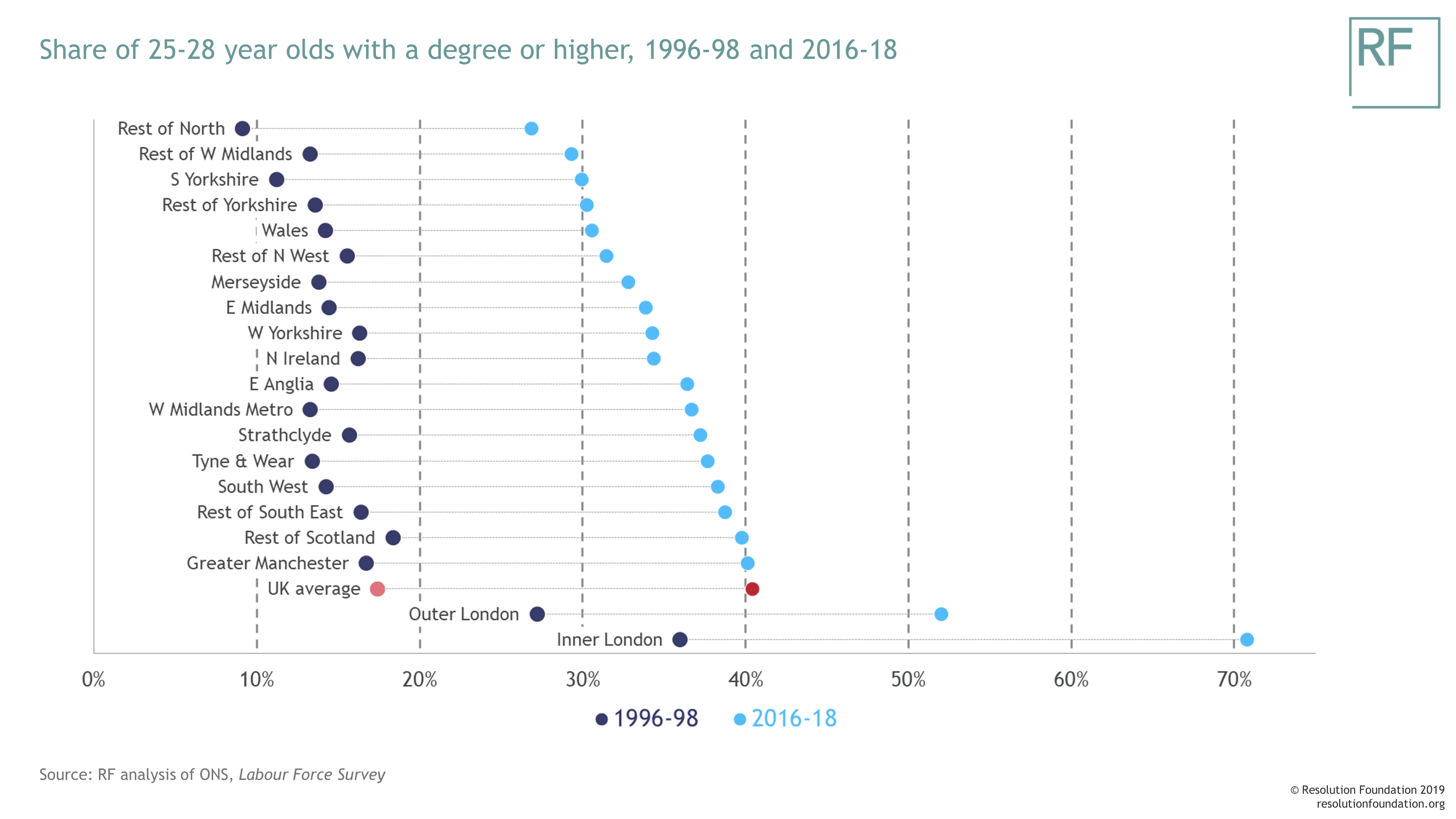 There are also clear regional gaps: the degree attainment rate among 25-28 year olds in South Yorkshire during 2016-18 (30 per cent) was just below the degree attainment rate in inner London a full 20 years earlier (36 per cent). In fact, the regions which experienced the largest percentage point growth in the size of their young degree-holding populations were those that began the period with an above-average share. Those that started out behind the pack have struggled to make relative gains.