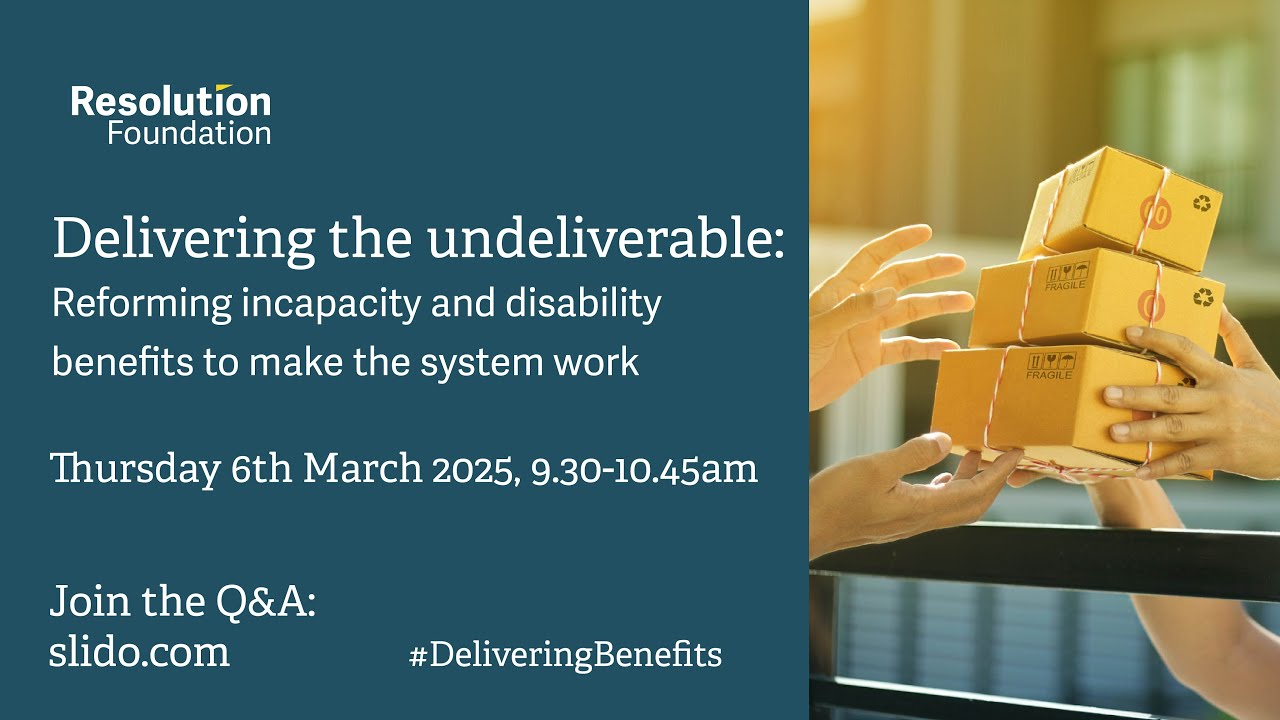 width="560" height="315" frameborder="0" allowfullscreen="allowfullscreen"> Britain is becoming sicker, with a sustained increase in levels of ill-health and disability. This creates financial challenges for families, and a fiscal challenge for the Government, with spending on incapacity and disability benefits forecast to rise from £40 billion today to £60 billion by the end of the Parliament. Everyone agrees that the current system is not working. But no-one can agree on how to change it. The Government will need to break that stalemate in its upcoming Green Paper. What are the trends in ill-health and disability, and how reliable is the data? To what extent can we expect the welfare reform to solve a wider societal problem? How can the Government rebuild trust in the benefits system, support people into work, and reduce spending? And can it do this without hitting living standards of vulnerable people? The Resolution Foundation is hosting an in-person and interactive webinar to debate and answer these questions. Following a presentation of the key highlights from new research, we will hear from leading experts on how the Government should approach important reforms to incapacity and disability benefits in a way that doesn’t harm living standards. The event will be open for people to physically attend, alongside being broadcast via YouTube and the Resolution Foundation website. Viewers will be able to submit questions to the panel before and during the event via Slido. width="476" height="400" frameborder="0" marginwidth="0" marginheight="0" scrolling="no">