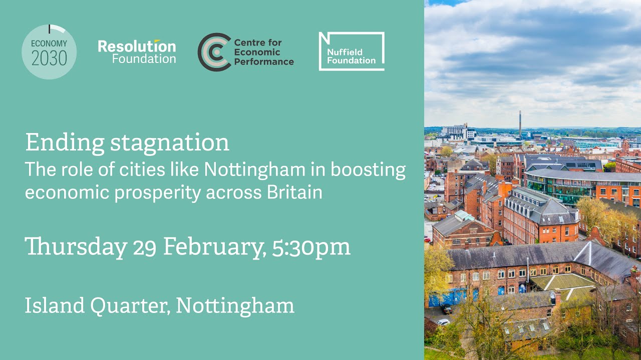 This event was in Nottingham. A toxic combination of 15 years of low growth, and four decades of high inequality, has left Britain poorer and falling behind its peers. Productivity growth is weak and public investment is low, while wages today are no higher than they were before the financial crisis. Britain needs a new economic strategy to lift itself out of stagnation. Nottingham is in many ways a microcosm of this national challenge. It has become a hub for creative industries in the East Midlands, serving as the headquarters for major firms like Games Workshop, as well as global giants like Boots and e.on. The city’s many strengths – including the world-class university and services firms – must be harnessed to meet the economic challenges of the coming years. But it also has high levels of deprivation, and won’t be truly thriving unless it finds ways to ensure that all its inhabitants benefit from growth and investment. What should a new national economic strategy for Britain include? How will economic change affect the jobs we do, the places we live and the businesses we work for? And what are the prospects for cities like Nottingham, regions like the East Midlands, and nations like Britain to be able to rise to these challenges? The Resolution Foundation is hosting this event with the Institute for Policy and Engagement at the University of Nottingham to debate Britain’s future economic strategy, building on the analysis of The Economy 2030 Inquiry – a three-year collaboration between the Resolution Foundation and the LSE, funded by the Nuffield Foundation. We will be joined by leading experts from policy and business in the region to discuss how different areas of the UK – particularly Nottingham and the wider East Midlands region – can secure widely shared prosperity. title="YouTube video player" frameborder="0" allow="accelerometer; autoplay; clipboard-write; encrypted-media; gyroscope; picture-in-picture; web-share" allowfullscreen> width="476" height="400" frameborder="0" marginwidth="0" marginheight="0" scrolling="no">