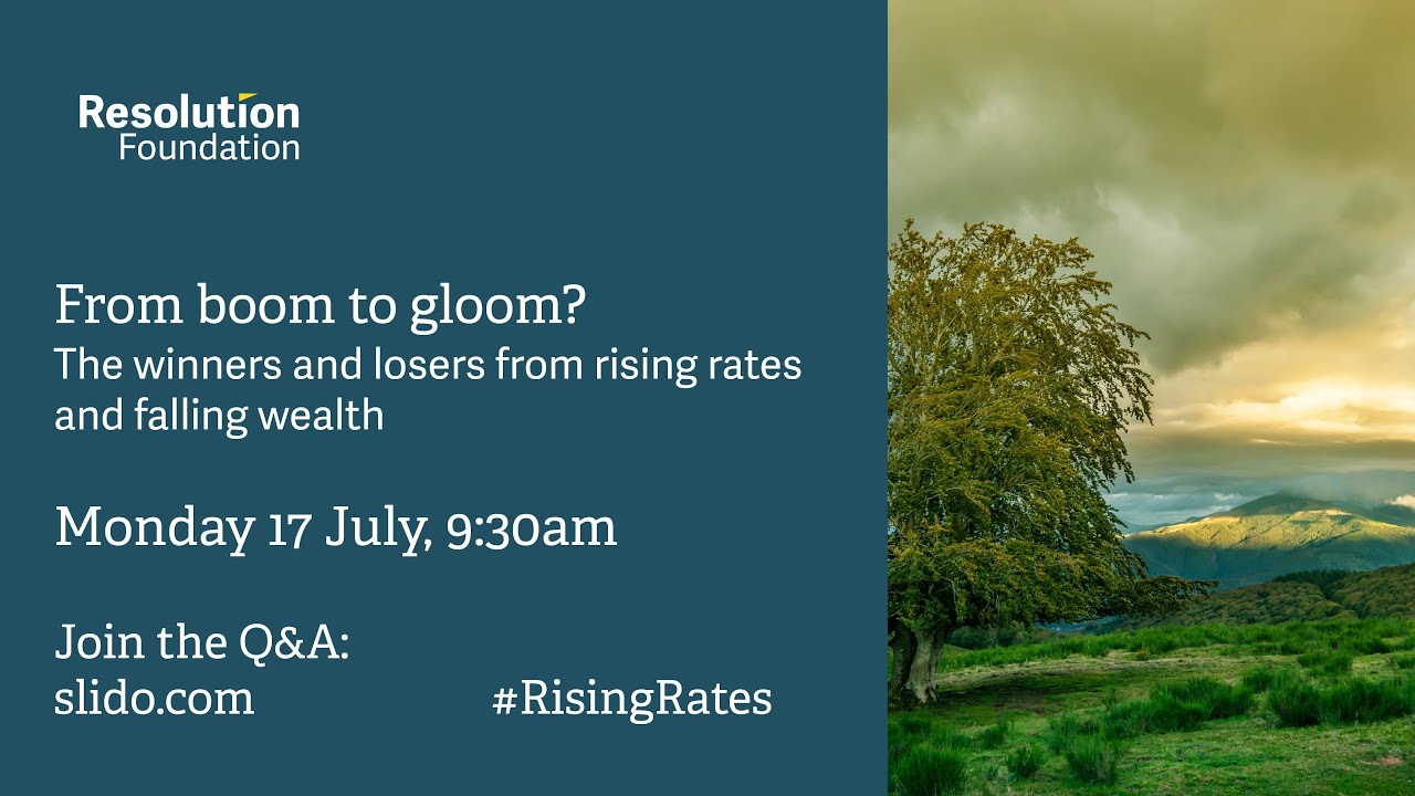 Britain has experienced a 30-year wealth boom, driven by record low interest rates, causing unprecedented levels of intergenerational inequality. But this has now been brought to an abrupt end, with the Bank of England embarking on the tightest rate-raising cycle since the early 90s – causing mortgage costs to rise, house prices to fall and pension valuations to crater. What are the wider economic effects of rising rates and falling asset prices? To what extent might the pinch being felt by middle-aged mortgagors be offset by gains for young perspective first-time buyers and older generations reliant on savings? And with the long-term outlook for interest rates uncertain, should policymakers take action to mitigate the social consequences of Britain’s changing wealth landscape? The Resolution Foundation is hosting an in-person and interactive webinar – as part of our ongoing wealth across Britain project, in partnership with the abrdn Financial Fairness Trust – to debate and answer these questions. Following a presentation of the key report highlights, we will hear from leading experts on the possible winners and losers from rising rates and falling wealth. The event will be open for people to physically attend, alongside being broadcast via YouTube and the Resolution Foundation website. Viewers will be able to submit questions to the panel before and during the event via Slido. width="560" height="315" frameborder="0" allowfullscreen="allowfullscreen"> width="597" height="486" frameborder="0" marginwidth="0" marginheight="0" scrolling="no" allowfullscreen="allowfullscreen">