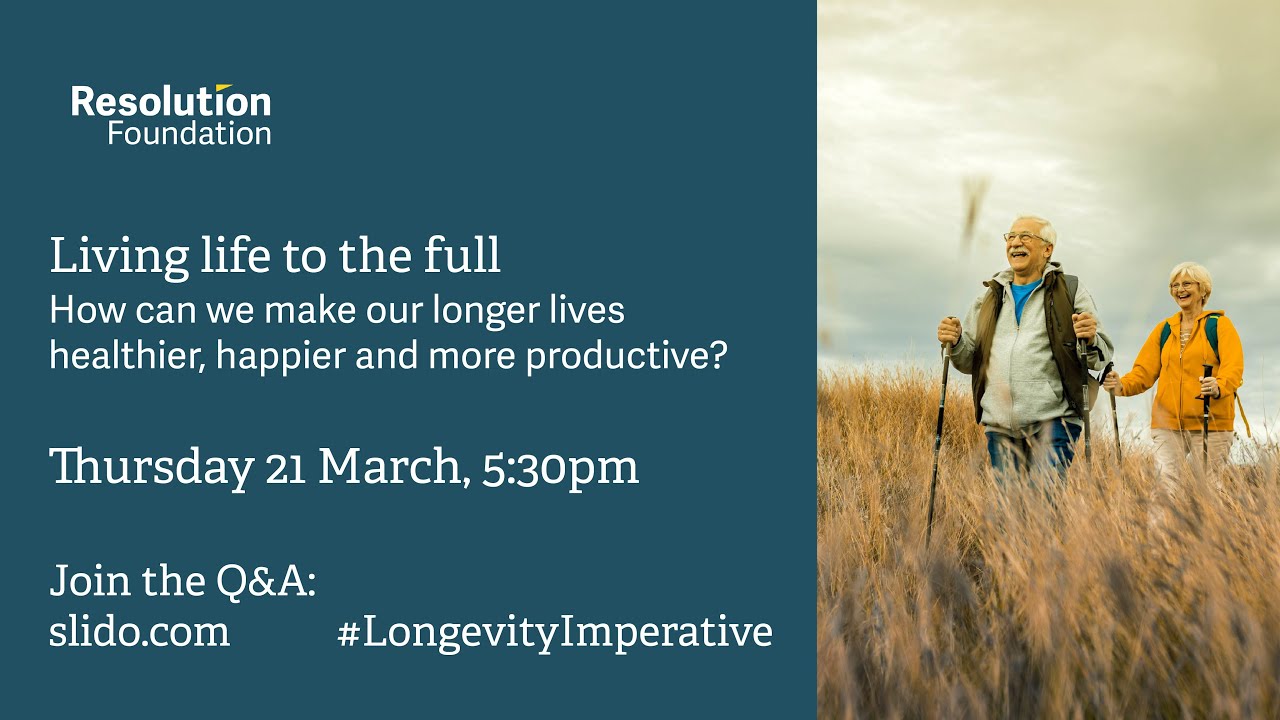 Book launch for The Longevity Imperative by Professor Andrew J Scott Britain, along with many other countries, is getting older and living longer. This demographic shift has huge health, economic and societal impacts, but too often the debate is limited to the fiscal costs of an ageing society, and pressures on the NHS. Instead we need to take a broader view of the changes this will bring, and the changes we can shape so that people live not just longer lives, but happier and healthier ones too. What has happened to life expectancy, what is likely to happen and what constitutes the longevity imperative? What are the economic consequences of this in terms of the public finances, productivity and the labour market? What can we do to age better? And how might this change how we live our longer lives? The Resolution Foundation is hosting an in-person and interactive webinar to mark the new launch of Andrew Scott’s new book The Longevity Imperative, and to debate and answer these questions. The event will be open for people to physically attend, alongside being broadcast via YouTube and the Resolution Foundation website. Viewers will be able to submit questions to the panel before and during the event via Slido. width="560" height="315" frameborder="0" allowfullscreen="allowfullscreen"> width="476" height="400" frameborder="0" marginwidth="0" marginheight="0" scrolling="no">