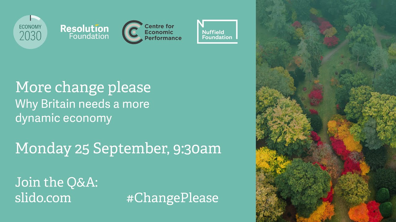 Change is accelerating, or so we are told. But while the world is changing, it’s far less clear that Britain’s economy is. In fact we’re seeing less industrial change, as some sectors grow and others shrink, than has been the case for decades. Fewer workers are moving jobs. This matters because, while many of us are ambivalent about change, such economic dynamism has historically been a big driver of productivity – and pay – growth. What has happened to the pace of economic change – for workers, firms and the economy as a whole? How much does this matter? Can policy makers help to foster a more dynamic economy? And what should be done to deal with the disruption that a more dynamic economy could bring? The Resolution Foundation is hosting an in-person and interactive webinar – as part of The Economy 2030 Inquiry, funded by the Nuffield Foundation – to debate and answer these questions. Following a presentation of the key highlights from new research on how to encourage more dynamism, we will hear from leading experts on the gains, challenges and trade-offs that more economic change will bring. The event will be open for people to physically attend, alongside being broadcast via YouTube and the Resolution Foundation website. Viewers will be able to submit questions to the panel before and during the event via Slido. width="560" height="315"> width="476" height="400" frameborder="0" marginwidth="0" marginheight="0" scrolling="no">