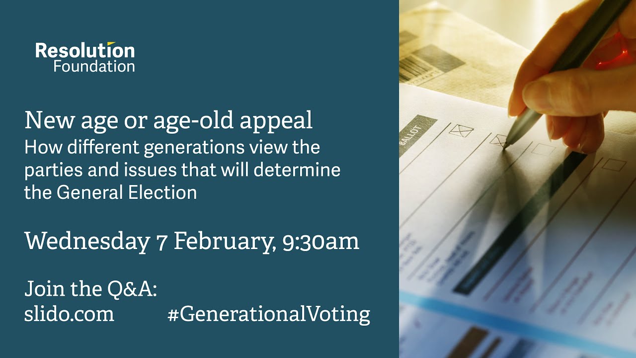 In recent decades age has replaced class as one of the key determinants of a voter’s values and voting behaviour. But these trends never sit still, especially as issues – from Europe to the environment, and the economy – rise and fall in terms of their electoral salience. We know that the next election will be very different to the last election. But the issue terrain on which the election will be fought, and what that means for different types of voters, is still up for grabs. What issues are most salient for different age cohorts, and how might it have changed since the last election? To what extent do other voter characteristics like income, education status and housing tenure play a role, both in how people vote, and whether they vote at all? And what might be the generational battle lines in the coming General Election? The Resolution Foundation is hosting an in-person and interactive webinar to debate and answer these questions. Following a presentation of the key highlights from new research on intergenerational voting intentions, we will hear from leading experts on how these issues might play out during the election year. The event will be open for people to physically attend, alongside being broadcast via YouTube and the Resolution Foundation website. Viewers will be able to submit questions to the panel before and during the event via Slido. width="560" height="315" frameborder="0" allowfullscreen="allowfullscreen"> width="476" height="400" frameborder="0" marginwidth="0" marginheight="0" scrolling="no">