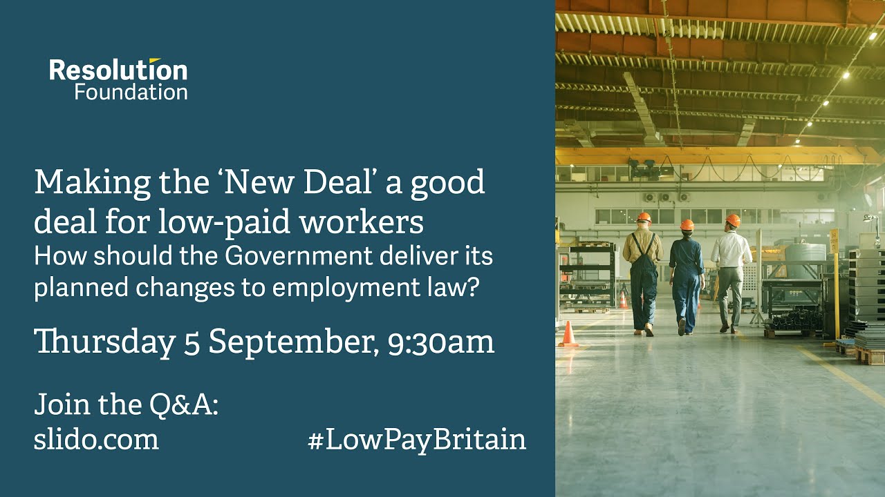 Register to attend in person or to receive an access link. The Government has come into office promising major workplace reforms that could amount to the biggest shake-up of the workplace in a generation. The ‘New Deal for Working People’ pledged a number of reforms, including to unfair dismissal, sick pay, employment status, zero hours contracts, the minimum wage, as well as changes to how employment rights are enforced. And while many of these reforms affect all workers, low earners will be most affected as they are disproportionately likely to have insecure work contracts, receive statutory rather than occupational sick pay, and not receive basic legal entitlements such as paid holiday leave. But, although the Government has set a clear direction of travel, there are many questions still unanswered. How will probationary periods be used – will protection against unfair dismissal really be a ‘day one’ right? Does announcing a cautious one-year minimum wage policy mean there are bigger changes still to come? How should possible trade-offs with employment be handled? What would be the impact of giving zero-hours contract workers a right to regular hours? The Resolution Foundation is publishing a series of major reports on five key economic challenges facing the new government – work, tax, housing, growth and the public finances. To kick off the series, the Foundation is hosting an in-person and interactive webinar on the economic challenge of work. Following a presentation of the key highlights from Low Pay Britain 2024, we will hear from leading experts on what the future of employment policy and low-paid work in the UK might look like. The event will be open for people to physically attend, alongside being broadcast via YouTube and the Resolution Foundation website. Viewers will be able to submit questions to the panel before and during the event via Slido. width="560" height="315" frameborder="0" allowfullscreen="allowfullscreen"> width="476" height="400" frameborder="0" marginwidth="0" marginheight="0" scrolling="no">
