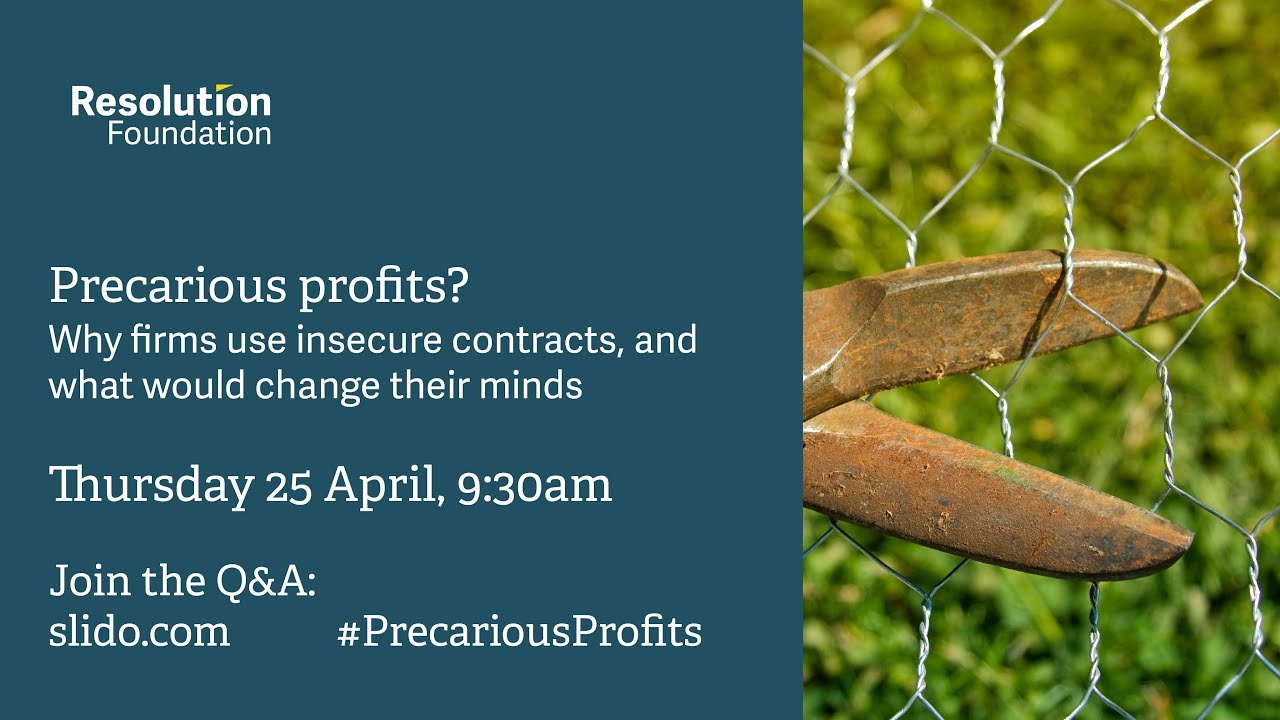 Over one-in-ten workers across Britain is employed on some form of precarious contract. The problems with such working arrangements for some workers are well known: they have limited control over their working patterns and insecure incomes too. But why firms use, or even come to rely on them, is rarely discussed and poorly understand. We need a far better understanding of both the causes of precarious employment and the consequences if work practices were to change. What kinds of firms and sectors are most likely to employ staff on precarious contracts? Does that vary across different types of employment, from fixed term to zero hour contracts? Do firms choose this approach to better serve their customers, give workers the flexibility they want, or does it boil down to the bottom line? What would it take for firms to change their approach – and what would the consequences be? The Resolution Foundation is hosting an in-person and interactive webinar to debate these questions, and share new evidence from a specially commissioned survey of firms. Following a presentation of this research, which marks the start of a major new project on precarious work, supported by Unbound Philanthropy, we will hear from leading experts from the world of business on firms’ use of insecure contracts. The event will be open for people to physically attend, alongside being broadcast via YouTube and the Resolution Foundation website. Viewers will be able to submit questions to the panel before and during the event via Slido. width="560" height="315" frameborder="0" allowfullscreen="allowfullscreen"> width="476" height="400" frameborder="0" marginwidth="0" marginheight="0" scrolling="no">