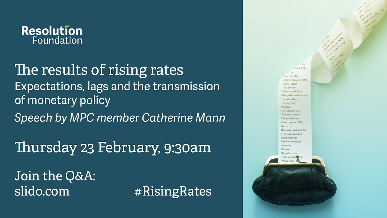 Speech by MPC member Catherine Mann Central bankers around the world have been busy raising interest rates from their historical lows in the face of mounting inflation, with the Bank of England raising the base rate at their last ten MPC meetings. But the big question for policy makers is not just what the impact of those rate rises has been, but what it will be. That lies behind the difficult judgement about whether enough has been done to bring inflation back down to target, which has big implications for living standards and the wider economy. How big and how swift will the impact of interest rate rises be? Has the long duration of near zero bank rates, along with the recent shocks, changed the received wisdom that rates take 18-24 months to have their full effect? And, if a slower transmission means a longer period of above target inflation, does this affect inflation expectations? The Resolution Foundation is hosting a major speech from Bank of England MPC member Dr. Catherine L Mann to debate and answer these questions. Following her speech, Catherine will take part in an audience Q&A, chaired by RF Chief Executive Torsten Bell. The event will be open for people to physically attend, alongside being broadcast via YouTube and the Resolution Foundation website. Viewers will be able to submit questions to the panel before and during the event via Slido. width="560" height="315" frameborder="0" allowfullscreen="allowfullscreen"> width="476" height="400" frameborder="0" marginwidth="0" marginheight="0" scrolling="no">