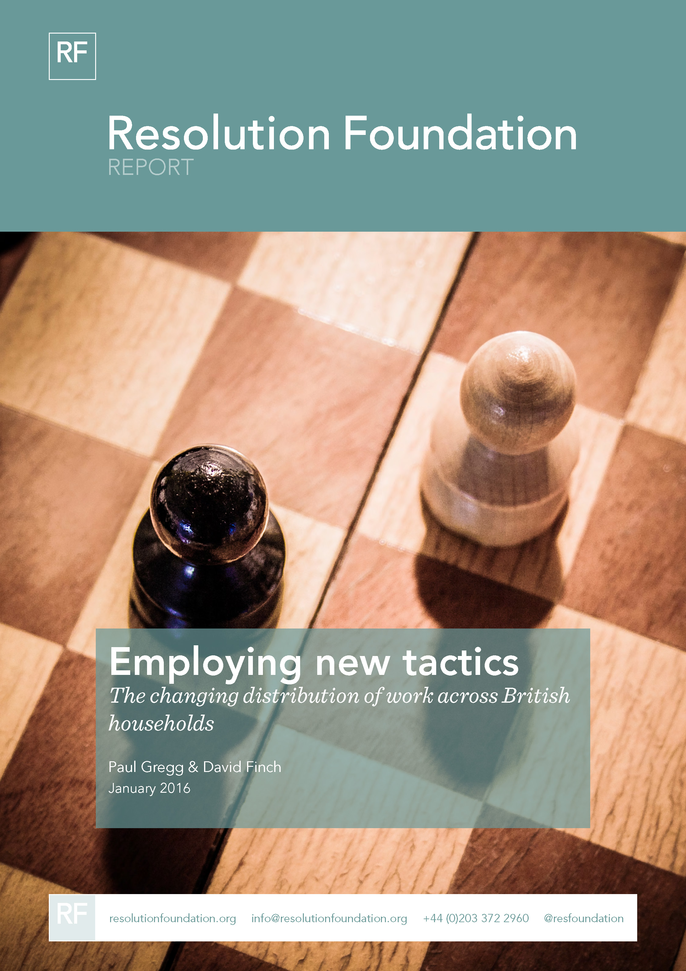 Labour market Employing new tactics: the changing distribution of work across British households 31 January 2016 Paul Gregg David Finch Inevitably, discussion of employment tends to focus on individuals. But this means that an understanding of how work – and the income that it brings – is shared across different types of households can be lost. During the 1980s and early-1990s employment became increasingly polarised in society, with increasing concentrations of workless single or couple households and dual earner couples. This polarisation underpinned high rates of income poverty, particularly among children – 3.4 million children were in poverty by 1996-97 and one-in-five children lived in a workless household. In the last two decades the picture has changed dramatically, with the proportion of workless households in 2015 reaching a 30 year low – falling from 20.5 per cent in 1996 to 15.4 per cent in 2015. This report investigates what has driven this fall and highlights the policy challenges that remain to further reduce worklessness and move closer towards full employment.