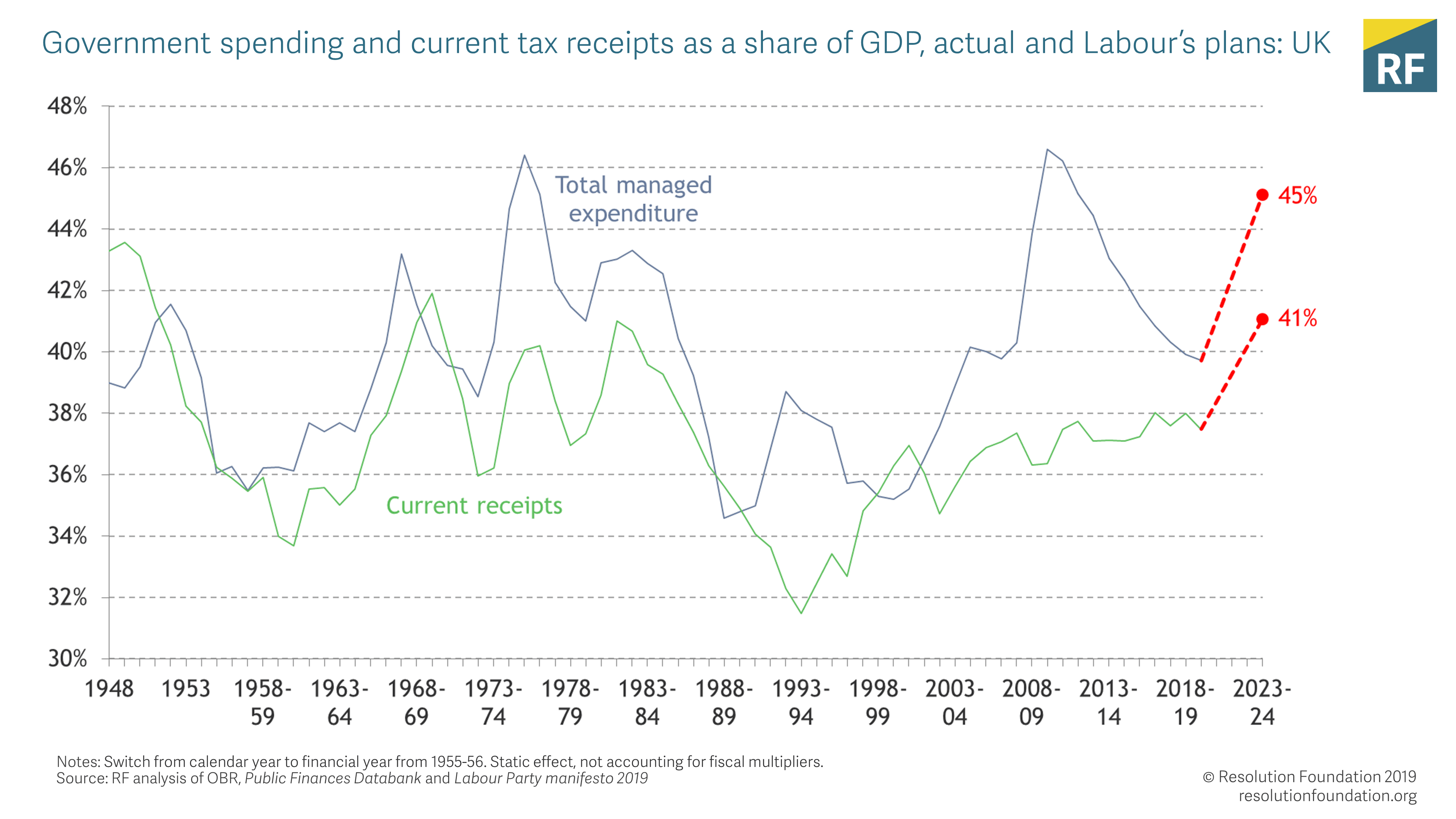Political parties and elections Doubling down on a bigger state Assessing Labour’s 2019 manifesto 22 November 2019 Torsten Bell Summary Labour have doubled down on plans to increase the size of the state, and their ambitious spending pledges have been matched by ambitious revenue-raising plans. There is now a very big choice facing the country on the size of the state it wants, and how it should be funded. Their manifesto also builds on the tax and spend focus of the 2017 predecessor, with much more radicalism in its approach to economic reform. To-do lists are very useful things in life – keeping you focused on what you want to achieve while the world conspires to knock you off course. Election manifestos provide the to-do lists for any party that aspires to govern. And my-oh-my Labour’s new to-do list is very, very long. That is both its strength, and its weakness. It is its strength because it shows that the party has an agenda – a view of the country and the change it wants to bring. But it is also its weakness because once a to-do list becomes too long it no longer helps you get anything done. It just stresses you out. The big picture takeaway from the Labour’s 2019 manifesto is: take the core anti-austerity message of its 2017 predecessor, ramp it up hugely and add in two additional substantive agendas that got much less focus two years ago – economic reform and climate change. Ramping up the anti-austerity core is hardly surprising – the debate has changed drastically over the last few years so that austerity is ending, whoever wins. The Lib Dems yesterday proposed as big an increase in tax and spend as labour did in 2017. Meanwhile the Conservatives have also called for up to £20 billion of extra investment spending. But if the state is getting bigger whoever wins, it’s getting much, much bigger under Labour. The 2019 Manifesto literally doubles down on the spending increases in the 2017 manifesto – upping them from £70 billion to £135 billion. That £135 billion is made up of £55 billion of extra investment spending (with climate change much more of a priority than in 2017) and £80 billion on day-to-day spending (with free at the point of use social care the main new priority on a much longer list of promises, including free broadband). These, combined, would take our state from just below 40 per cent of GDP to the mid-40s (45 per cent without taking into account the impact of the huge fiscal stimulus on the size of the economy, and around 44 per cent with it included). These plans would represent the biggest increase in state spending (outside of recessions) since the first Wilson government of the swinging sixties, as shown in Figure 1. Figure 1: Labour’s plans would dramatically increase the size of the state This is a simply huge increase that takes us to a big state by historical standards. But the UK’s state would still only be a little above the OECD average as a share of GDP, and roughly in line with Germany’s, as shown in Figure 2. Figure 2: Labour would take the size of the state to slightly above the OECD average Tax Labour’s ambition on spending is matched by the party’s ambition on tax. Again, starting with the big picture, Labour is planning to take tax revenues (in relation to the size of the economy) to a 50-year high, as previously shown in Figure 1. In 2017, Labour’s tax strategy focused on raising income tax on the top 5 per cent of the workforce – those with incomes of £80,000 or more. As the scale of the party’s ambitions has increased, the relative importance of higher income tax to overall revenue-raising plans has diminished, despite its rhetorical prominence. The £5.4 billion Labour intends this policy to raise only represents a tiny part (under 7 per cent) of Labour’s intended £83 billion of higher tax revenues. The new addition on individual taxes in this manifesto is a plan to raise tax rates on capital gains (currently 20 per cent for a higher-rate taxpayer) and dividends up to the levels of income tax rates (40 per cent for higher-rate taxpayers). This aims to raise £14 billion. There are strong arguments for tightening up the UK’s capital gains tax rules in particular. We’ve long argued for the scrapping of Entrepreneurs’ Relief – dubbing it Britain’s worst tax break – which Labour intends to do. Labour’s proposal for a rate-of-return allowance within our capital gains tax system is also sensible, if not straightforward. The proposal on dividend taxation however is more challenging, given that corporation tax will already have been paid. The context here is Labour’s plan to also significantly raise corporation tax to 26 per cent – its level a decade back. The UK should bring corporation tax reductions to an end, and could raise the headline corporation tax rate. But it is important to recognise that wider changes over the past decade that raise revenue mean that a 26 per cent headline rate would drive a significantly higher tax take than it once did. Who would eventually pay those higher taxes is complex, but it would include shareholders, workers and customers. Higher capital gains and dividend taxation will most clearly be felt towards the top of the income distribution, although the scale of the tax increases proposed means that far more than the top 5 per cent of the workforce will be affected. As an example, higher corporation and dividend taxation will have a material effect on defined contribution pension schemes. One advantage of the kind of reform Labour envisages in reconsidering how we tax corporations, dividends and capital gains is that it will narrow (although far from eliminate, given huge employee National Insurance differences) gaps between the tax treatment of different forms of income. These have provided very unwelcome tax incentives for people to be self-employed rather than employees, or to incorporate. Addressing this represents an important step towards both prot