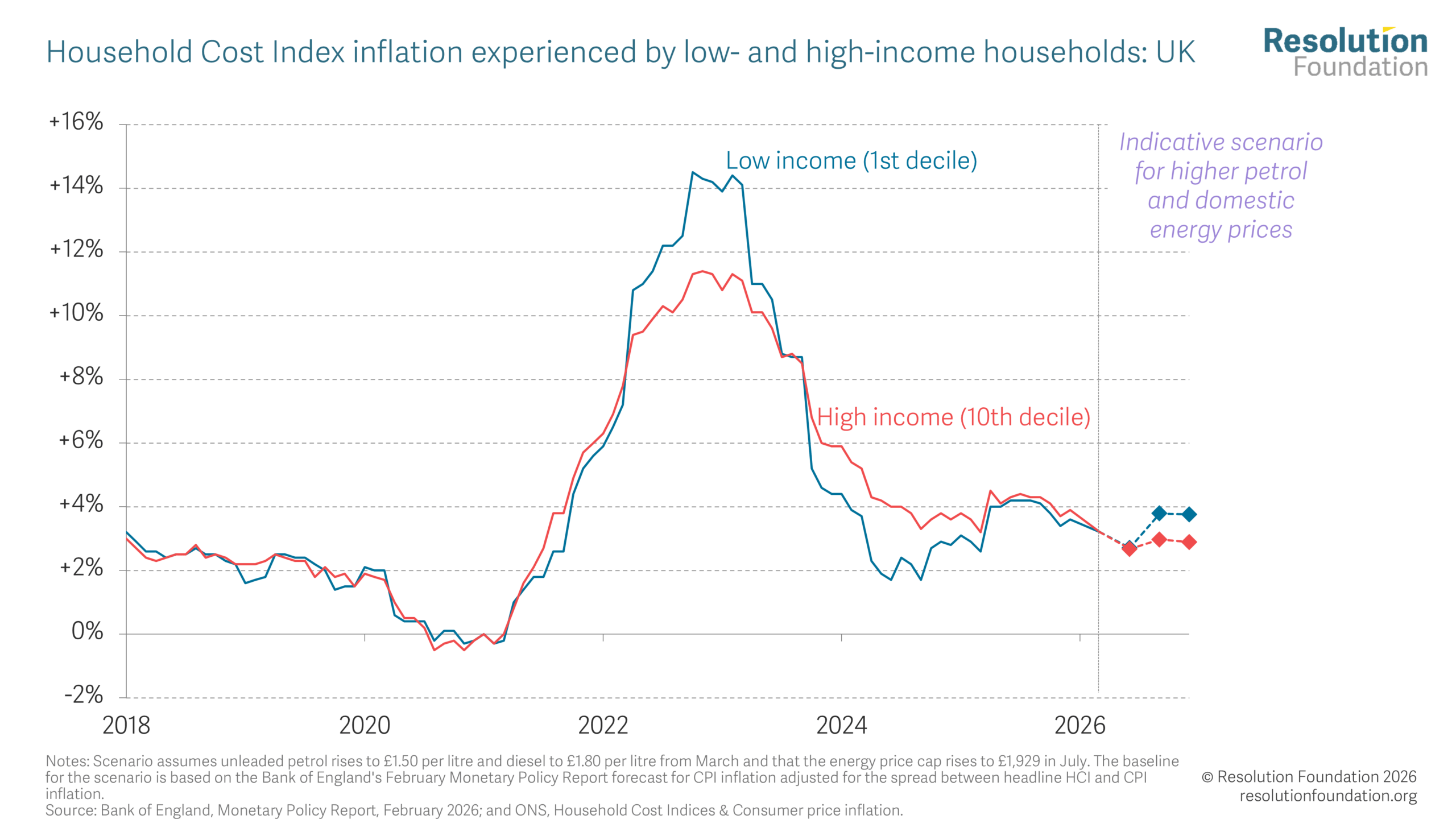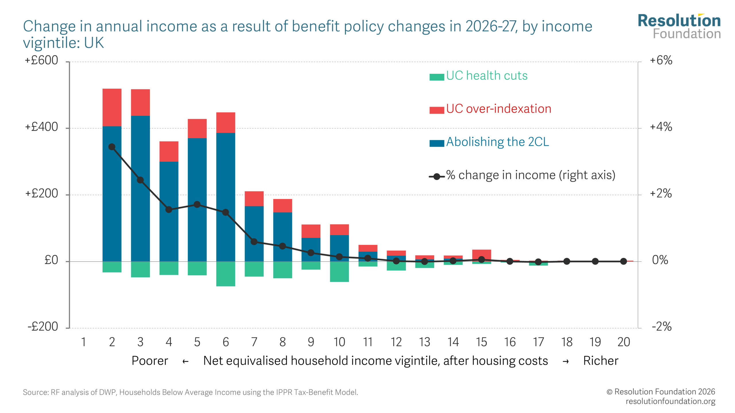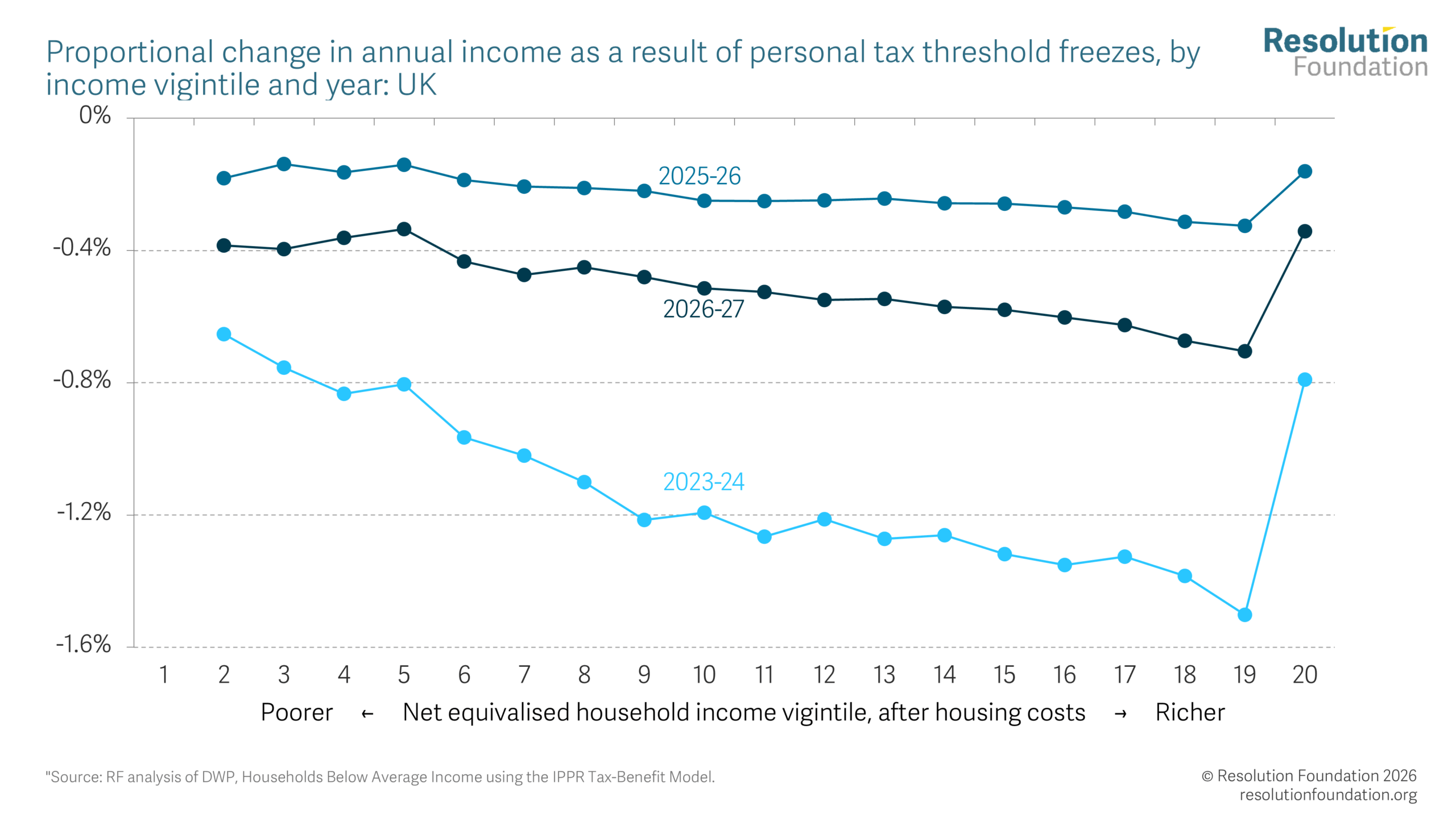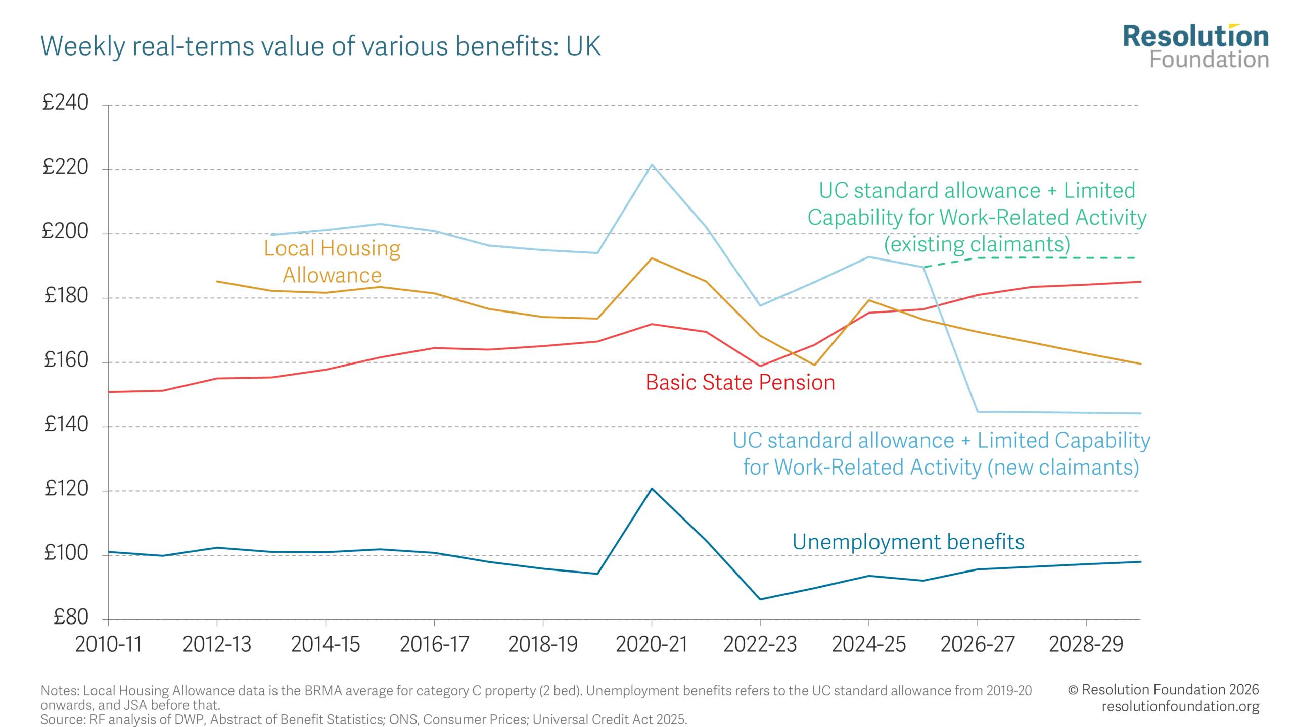 Living standards· Incomes· Tax· Welfare Happy new tax year 2026 Putting tax and social security changes in the context of rising energy bills 2 April 2026 Lalitha Try The start of April marks the beginning of the new tax year, meaning households will face a wide range of tax, benefit and utility bill changes. Benefit changes in April will boost incomes for the poorest families, particularly the removal of the two-child limit, which will give back £4,560 this year to the affected families. Unemployment benefits will, for the first time since 1983, be permanently uprated by more than the default inflation rate, but will still be 5 per cent lower in real terms than they were in 2010-11. And personal tax threshold freezes continue to drag down incomes, as do Council Tax rises. Energy bills will fall in April, but the outlook for the year as a whole is very uncertain due to the war in Iran. The energy price cap will almost certainly rise in July: even in the plausible best-case scenario, annual bills would rise by around £130, and in a higher-price scenario bills could settle at close to £2,100, returning to a level at which the Government has historically intervened. Under Cornwall Insight’s latest forecast, a typical household will be expected to spend £30 more on energy in Q3 than if the price cap had remained at its Q2 level, as 14 per cent of energy spending takes place in Q3. Given that lower-income households spend more of their income on energy and related costs (such as fuel and food) than higher-income ones, they will be hardest hit by this price rise, with households in the lowest income decile experiencing a rate of inflation that is 0.9 percentage points higher than that of the highest income decile. A range of tax and benefit policies are coming into force this April, alongside changes in the energy price cap.[1] But this year there is much more uncertainty than usual: the impact of the war in Iran on oil and gas prices is a serious headwind to living standards in the UK over the coming months. This spotlight sets out some of the key changes that will affect household incomes in 2026-27, and how the conflict in the Middle East could affect this as the year goes on. Some big benefit rises are set to boost incomes for low-income households Three major benefit changes take effect in April 2026, and the impact of these is shown in Figure 1. The most important of these is abolishing the two-child limit – a much-needed step to bring down child poverty (and reduce a growing gap between poverty rates for children in families with three or more children and families with one or two children) and to eliminate a major unfairness in the benefit system. Its impact is significant: the Government estimates that the removal will bring child poverty down by 450,000 in 2029-30. In 2026-27, the average family who benefits from the two-child limit being scrapped will gain £4,560, pushing up the incomes of the poorest fifth of households by £290 on average.[2] Figure 1: Low-income households will gain significantly from benefit changes There are smaller gains for all families receiving Universal Credit (UC), shown in the red bars in Figure 1. April 2026 marks the first of four years that the UC standard allowance will rise by more than inflation (an extra 2.3 per cent this year, with UC being 4.8 percent higher than it would have been otherwise by 2029-30), and the first time since UC was introduced that it has been increased by more than the previous September’s inflation rate or by more than the State Pension. The UC standard allowance will rise by £6 a week, which will increase incomes for the bottom fifth by £90 on average. This above-inflation uprating will cost the Government £810 million in 2026-27, while abolishing the two-child limit costs £2.4 billion in 2026-27, rising to £3.1 billion by 2029-30. This over-indexation of UC is taking place as part of the Government’s plans to shift the balance of social security entitlements away from incapacity benefits and towards the standard element of UC.[3] The flip side is that from April 2026, new UC Health claimants will receive a health element that is half the rate of that for existing claimants, at £50 a week. For existing claimants, UC Health will rise by 1.5 per cent (as opposed to 3.8 per cent, September 2025’s rate of inflation), so that their combined UC award will rise by inflation. These changes will reduce incomes in the bottom fifth of the income distribution by an average of £40 (the green bars in Figure 1), although the losses (compared to a world without these changes) will clearly be much greater among the new claimants of UC Health that are directly affected. The standard allowance of UC will rise this year, but this still leaves unemployment benefits 5 per cent lower than they were in 2010-11 Figure 2 shows where these changes leave the real-terms levels of different benefits. This year’s UC uplift means that the basic rate of unemployment benefits will go up by more than inflation for the first time since 1983.[4] But the impact of this rise should not be overstated. The real-terms value of unemployment benefit is 5 per cent lower now than it was in 2010-11, 16 years ago, whereas the State Pension has risen by 20 per cent (and earnings rose by 5 per cent) over the same period. Indeed, only 63 per cent of the real-terms deterioration of the basic rate of unemployment benefit since 2010-11 will have been undone by 2026-27. Figure 2: Unemployment benefits are still 5 per cent lower than they were in 2010-11 Unlike UC and the State Pension, however, Local Housing Allowance (LHA) rates are set to continue falling in real terms through 2026-27. This is because, unlike other parts of the benefits system, LHA rates do not rise with inflation each year, and so the rates for 2026-27 will remain equal to the 30th percentile of local rents in the 12 months to September 2023. Private rents have risen markedly sinc