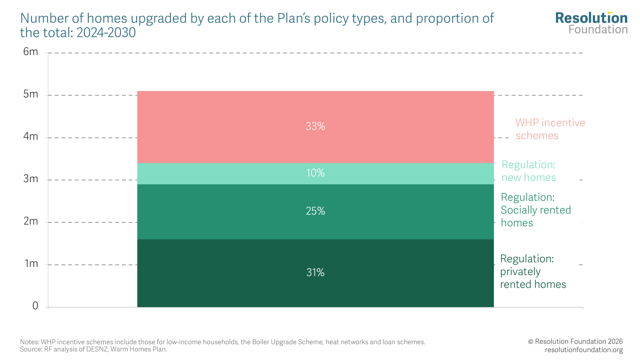 Combined, we can see that regulation is, in fact, doing a lot of the work. As we show in Figure 3, regulation will drive change in two-thirds of the five million homes targeted by the Plan. This highlights both its efficacy as a policy tool, and that widespread overhaul of the nation’s housing stock cannot be driven by incentives alone, despite the Government’s narrative.