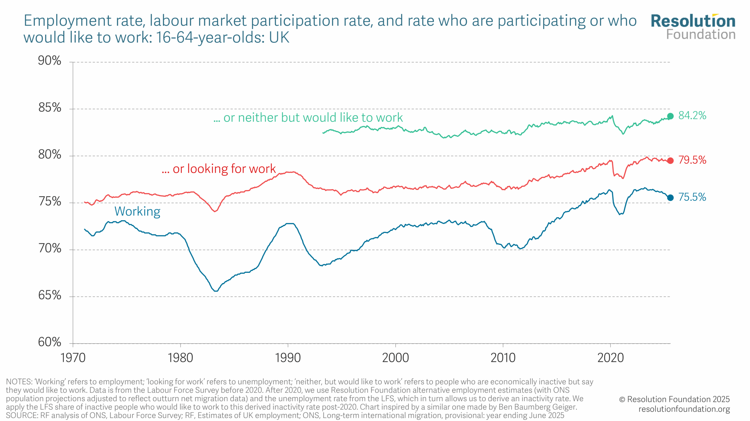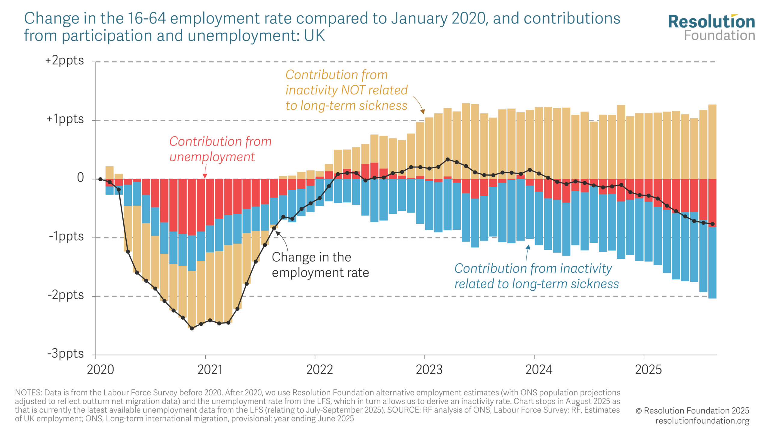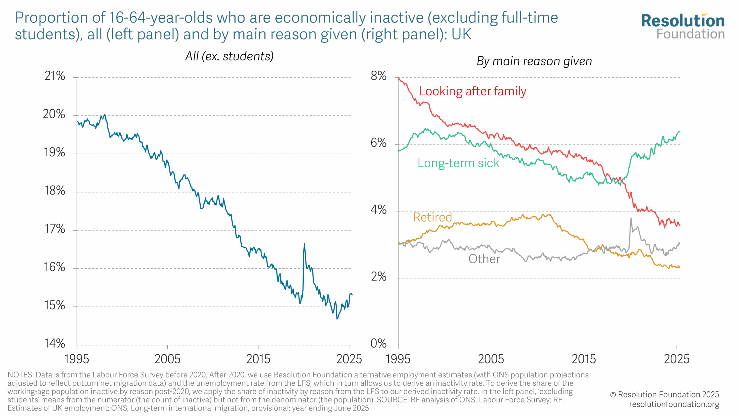 We have become accustomed to blaming participation for the UK’s post-pandemic employment problems. But in fact, economic inactivity is currently at more or less the same level it was on the eve of the pandemic. Again, that is true according to both the LFS inactivity rate and an estimate derived from the Resolution Foundation’s alternative employment estimate and the LFS’ unemployment rate (which we believe to be more reliable than its employment estimate). In the LFS, economic inactivity averaged 20.8 per cent in 2019, and in the latest data (covering the three months to September 2025) the rate was 21.0 per cent. Using our alternative estimates we put economic inactivity slightly lower at 20.5 per cent.[1]
