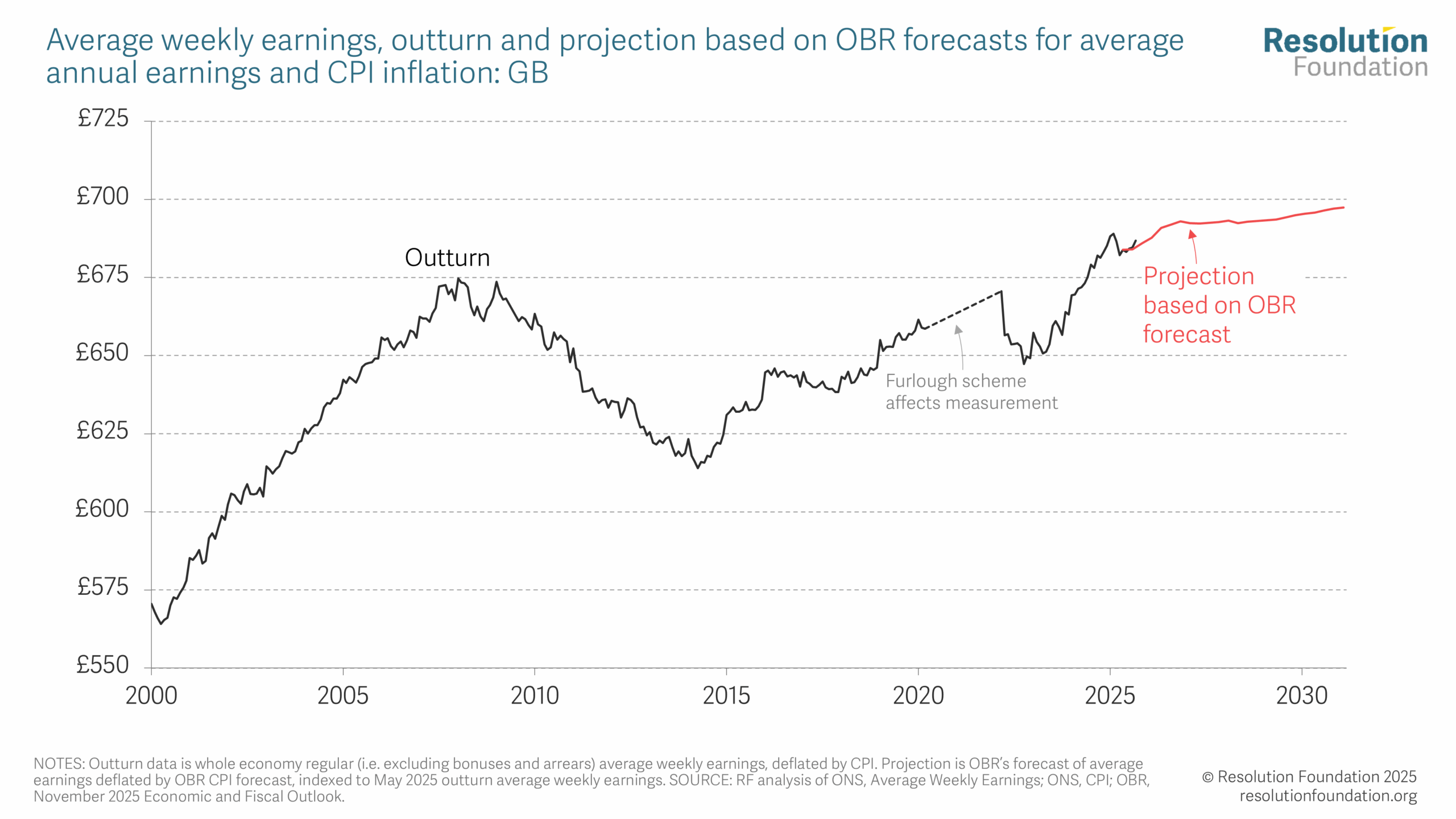 The labour market legacy of the 2008 financial crisis was a decade and a half of wage stagnation. As Figure 10 shows, inflation outpaced nominal wage growth between 2008 and 2014. And even when real wage growth resumed, it was sluggish – with real growth stalling in the aftermath of the Brexit vote and disrupted by the Covid-19 pandemic – so that, adjusted for CPI inflation, real wages did not get back to their 2008 level until 2024 (strictly speaking they did so in 2020 but this was partly a big composition effect rather than due to underlying wage growth). Workers have seen some welcome real wage growth in recent years, with real wages up 4.7 per cent between January 2023 and January 2025. But over the last year, wage growth has once again ground to a near halt – and the latest OBR forecasts suggest that this stagnation is set to continue, with wages set to grow by a paltry 2.0 per cent in total between now and 2031.