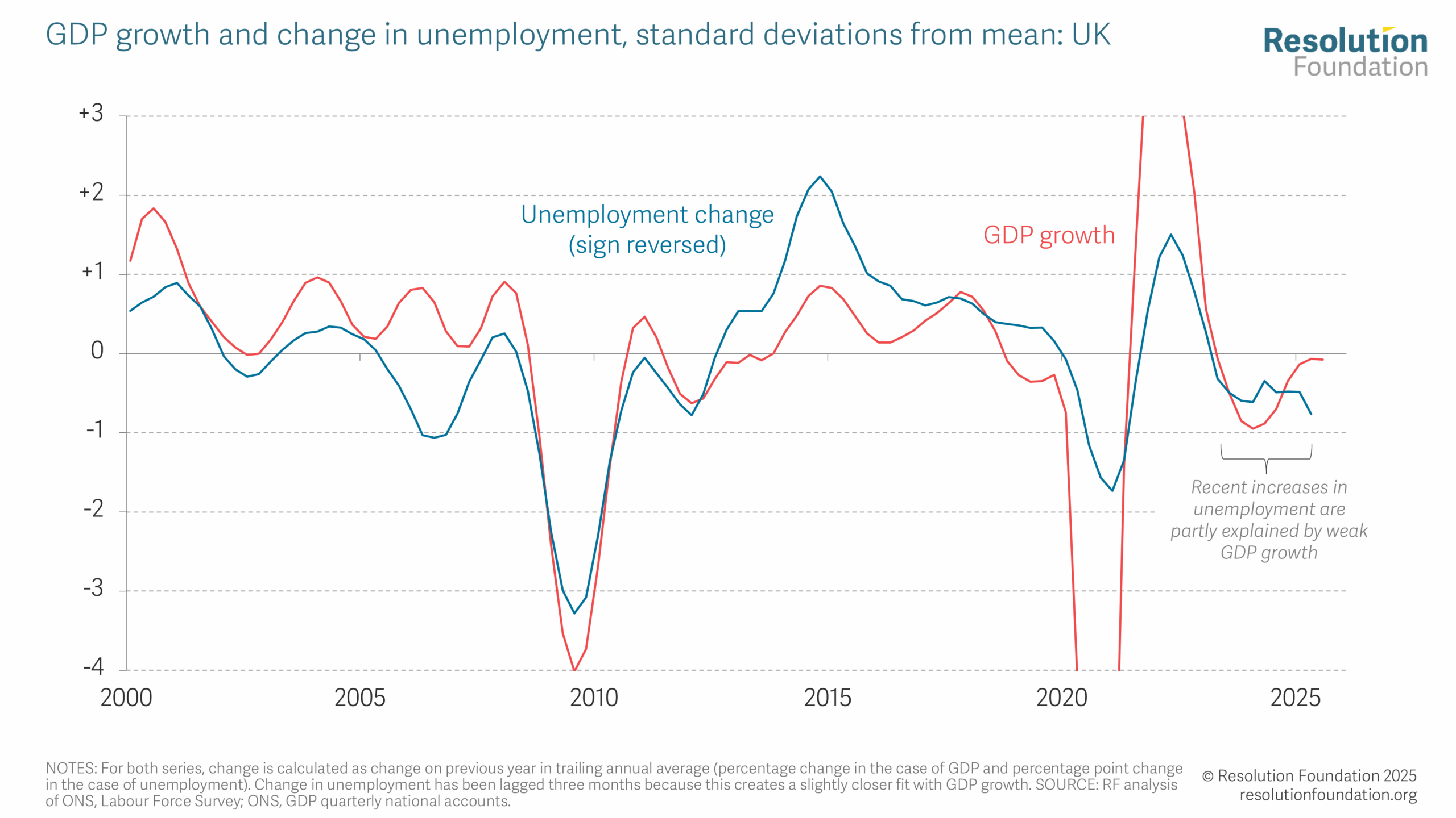 The recent rise in unemployment partly reflects the state of the economy more broadly. As Figure 4 shows, changes in unemployment tend to follow changes in GDP growth fairly closely. GDP growth was slow from late 2023 to mid-2024, and unemployment started rising from that point – consistent with the fact that GDP movements are known to affect unemployment with a lag.