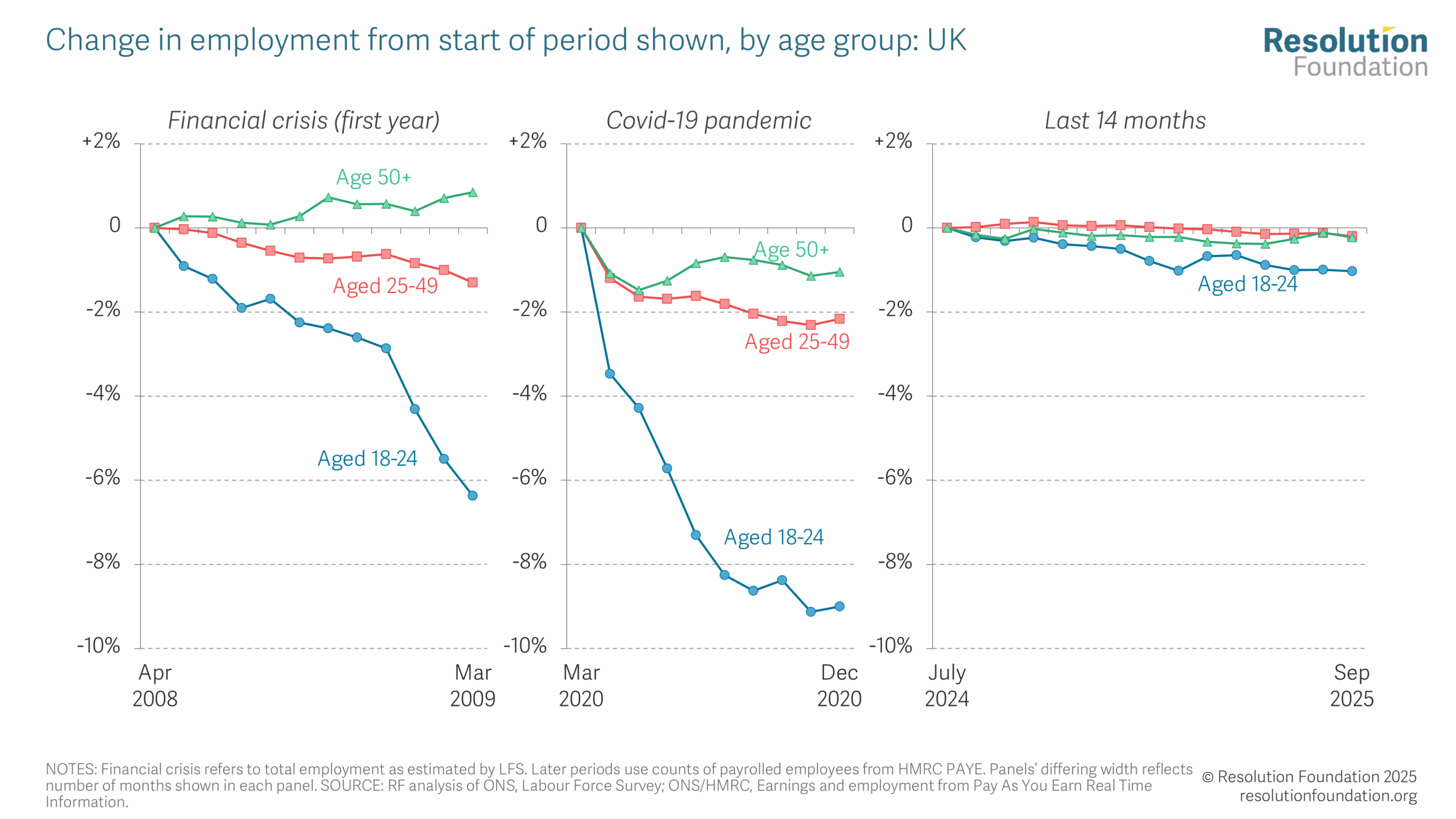Youth employment suffers during downturns because hiring slows down, making it harder for young people to get their foot on the job ladder. The vacancy rate fell by 37 per cent in the first year of the financial crisis, by 60 per cent in the first few months of Covid, and by 13 per cent over the past year (Aug-Oct 2024 to Aug-Oct 2025). Worse still, there is evidence that the hiring that does happen during downturns becomes more skewed towards older workers.
