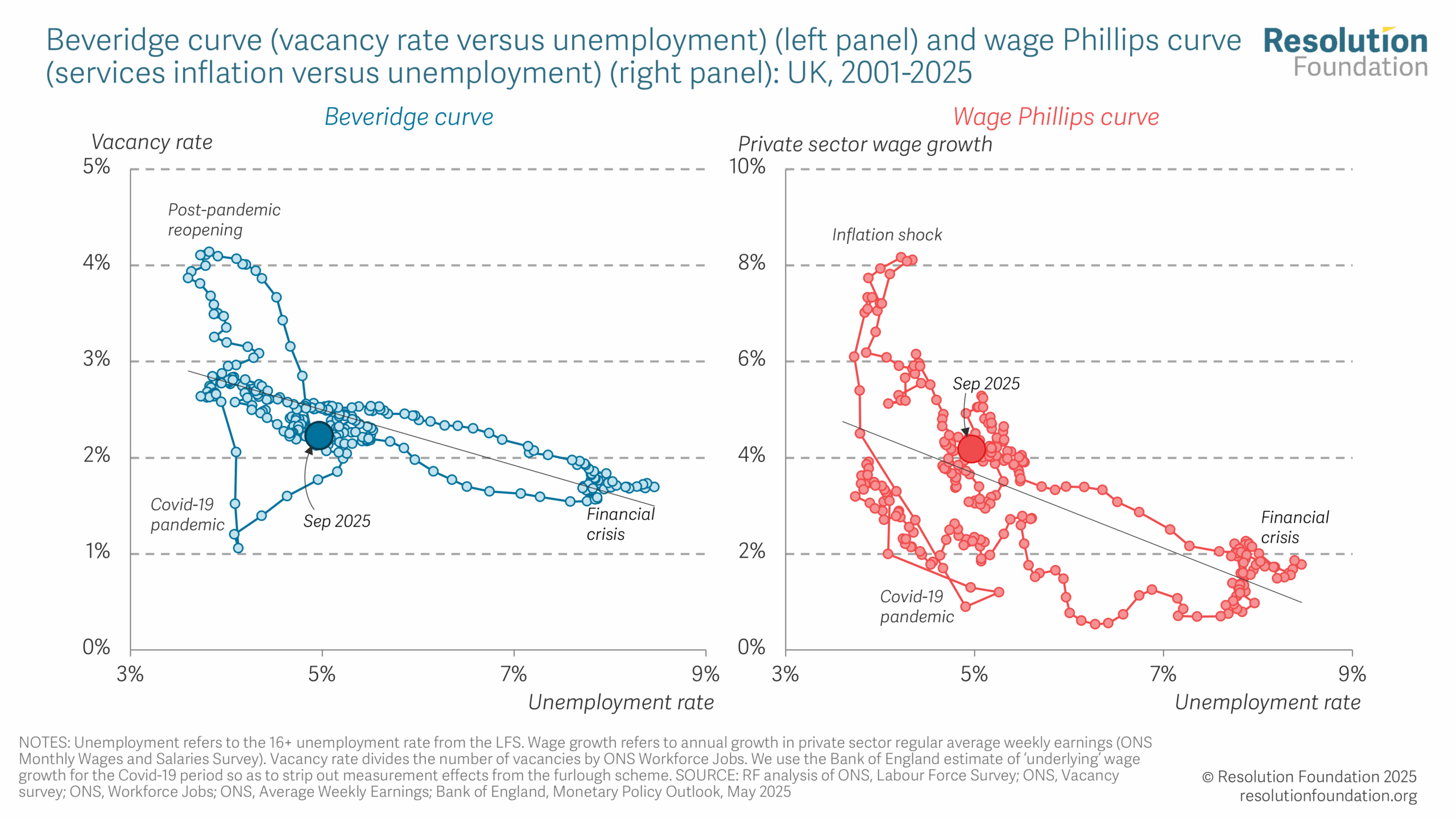 Second, it could be that workers expect large wage increases to compensate for high past or expected price inflation. This would reflect an increase in the ‘non-accelerating inflation rate of unemployment’ (NAIRU), and in this scenario, as with unemployment increases stemming from efficiency problems, the Bank would have less space to cut rates and bring unemployment back down again. The Bank of England discussed this possibility in its latest Monetary Policy Report but did not reach a firm conclusion. There does not yet seem to be strong evidence of this having happened. During the cost of living crisis, the level of wage growth (a key driver of inflation) was indeed high relative to unemployment based on the historic relationship between the two. But in recent months, wage growth has slowed, so currently the pace of wage growth is roughly what we would expect given the level of unemployment. This is expressed in the ‘Phillips curve’ chart shown in the right panel of Figure . This bodes well for the ability of the Bank of England to boost labour demand with lower interest rates.