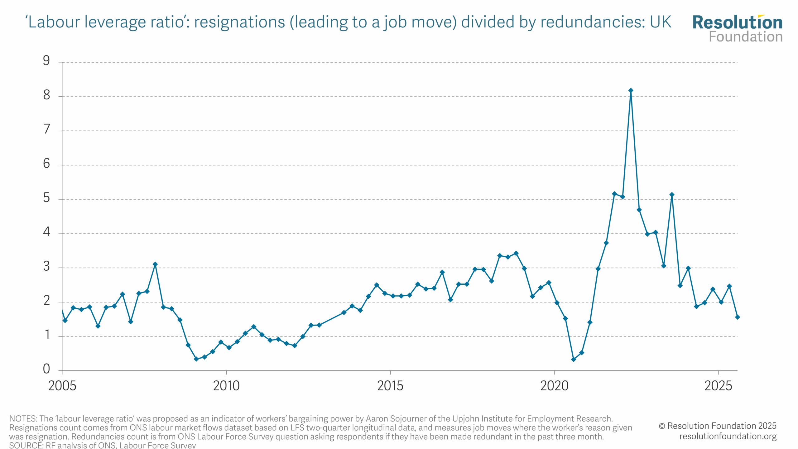 One consequence of a weaker labour market is that workers have reduced bargaining power: when fewer jobs are available and more people are looking for work, it becomes harder for workers to negotiate higher pay or better conditions, either with their current employer or a prospective new one. Figure 9 shows the ‘labour leverage ratio’, an indicator developed by Aaron Sojourner at the Upjohn Institute that captures workers’ bargaining power, calculated as the number of workers voluntarily leaving their jobs for another one (suggesting they can find better opportunities elsewhere), divided by the number of redundancies (reflecting weaker employer demand). This measure spiked as the economy reopened after the Covid-19 pandemic and employers went on a hiring spree, but has been falling since, and in Q3 2025 was at its lowest level (outside the Covid-19 pandemic) since 2012.