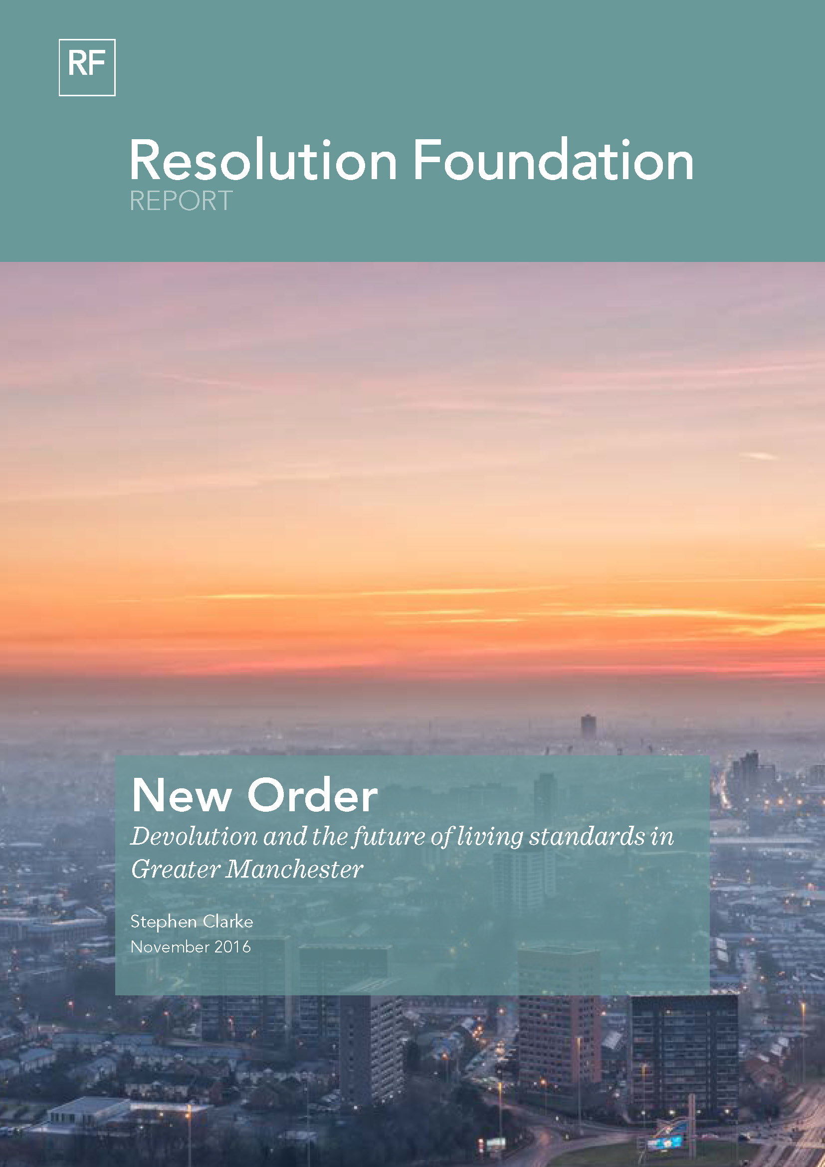 Living standards· Productivity & industrial strategy· Cities and regions New Order: devolution and the future of living standards in Greater Manchester 29 November 2016 Stephen Clarke In May 2017 Greater Manchester will go to the polls to elect the region’s first ‘Metro Mayor’. Greater Manchester has been at the forefront of the current programme of devolution and the new mayor will wield more power than any other city leader. However, it will be on the results of how this power is used, rather than its existence, that success will be measured. Given the region’s recent economic performance Greater Manchester’s new mayor will have a full in-tray. The region’s economy performed strongly before the financial crisis. Growth was faster than in the rest of the country; real wages rose by 15 per cent and employment rose by 4 percentage points in the decade to 2007. Since then though growth has disappointed; wages are still significantly below their pre-crisis peak and Greater Manchester did not see an employment boom to the same extent as the rest of the country. Furthermore new geographic inequalities have emerged, incomes in the richest neighbourhoods in the region are 1.8 times those in the poorest (up from 1.6 times in 2007) and since the crisis nearly all employment growth has occurred in the south of the conurbation. The new mayor will need to be a leader for the whole region.