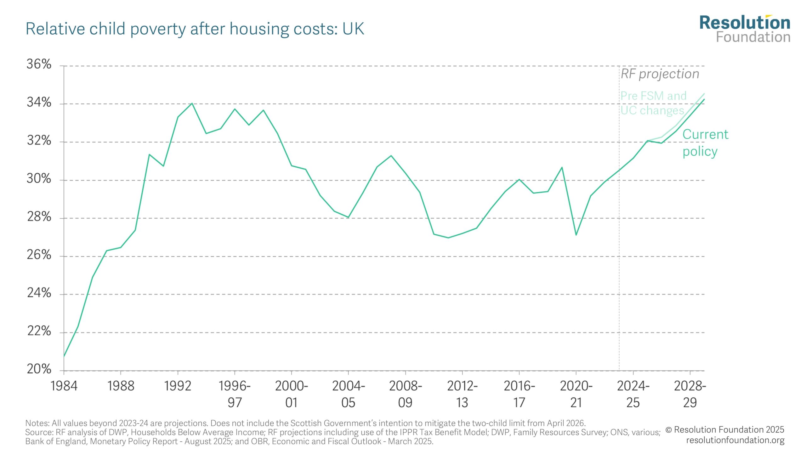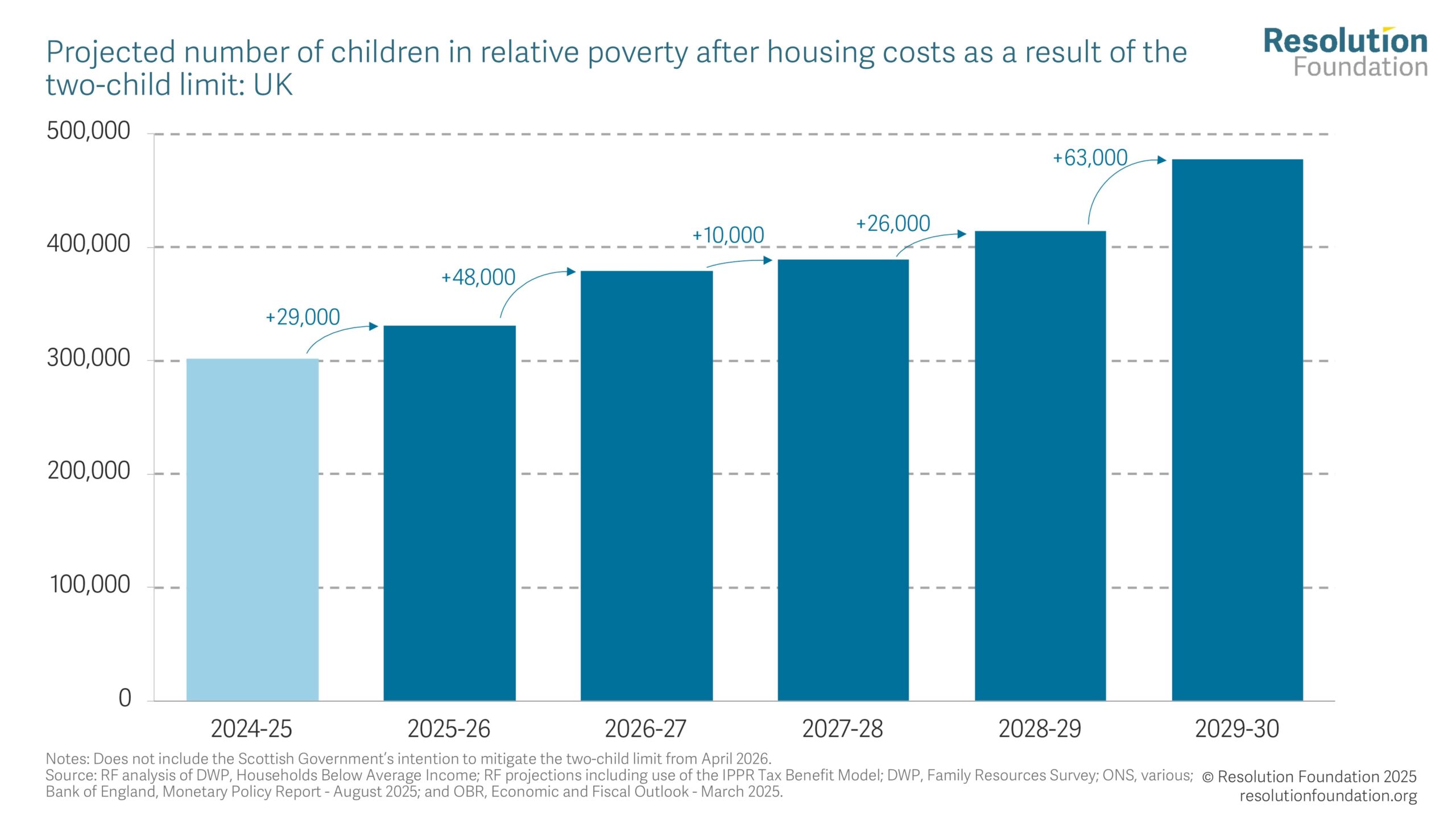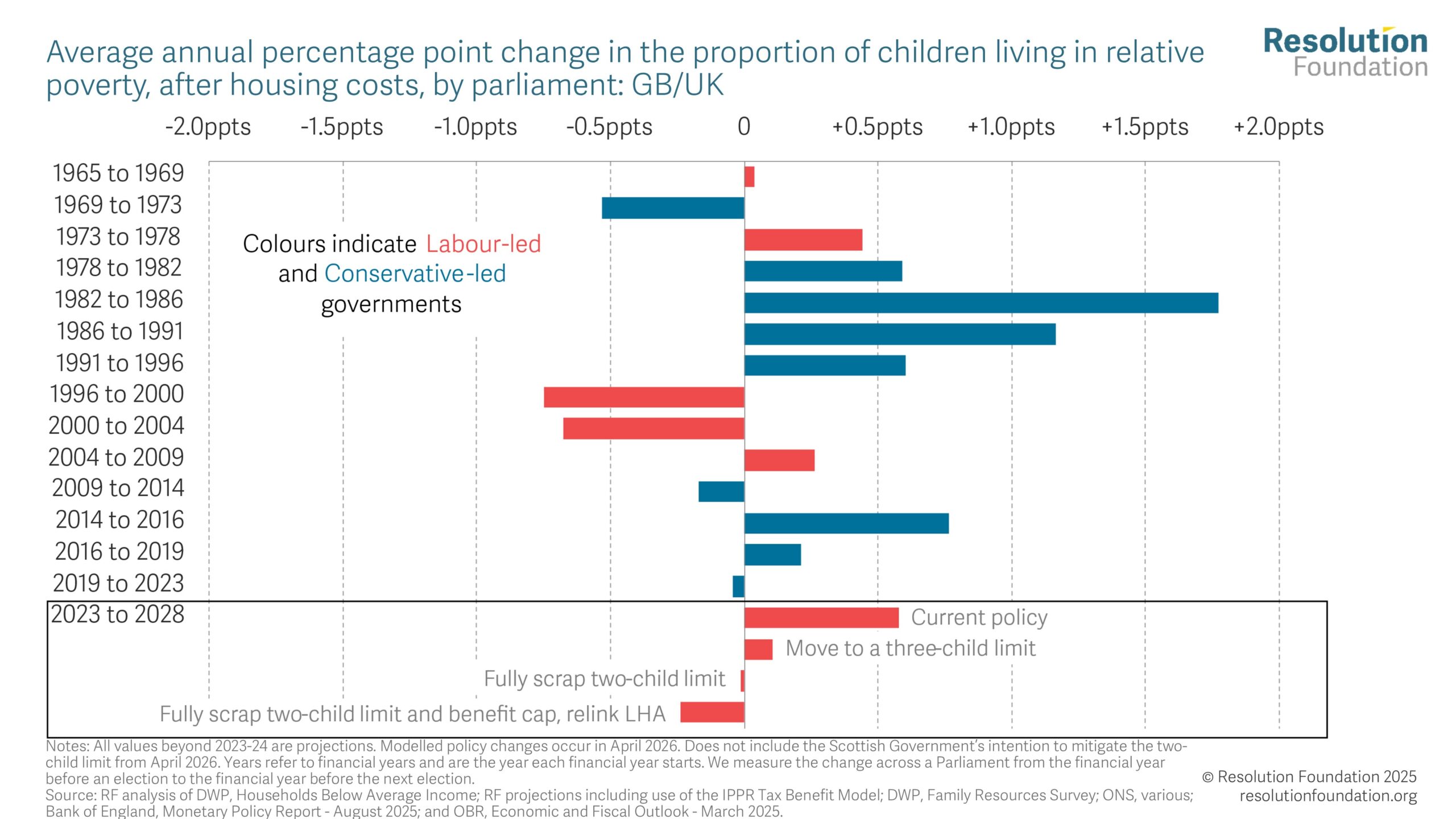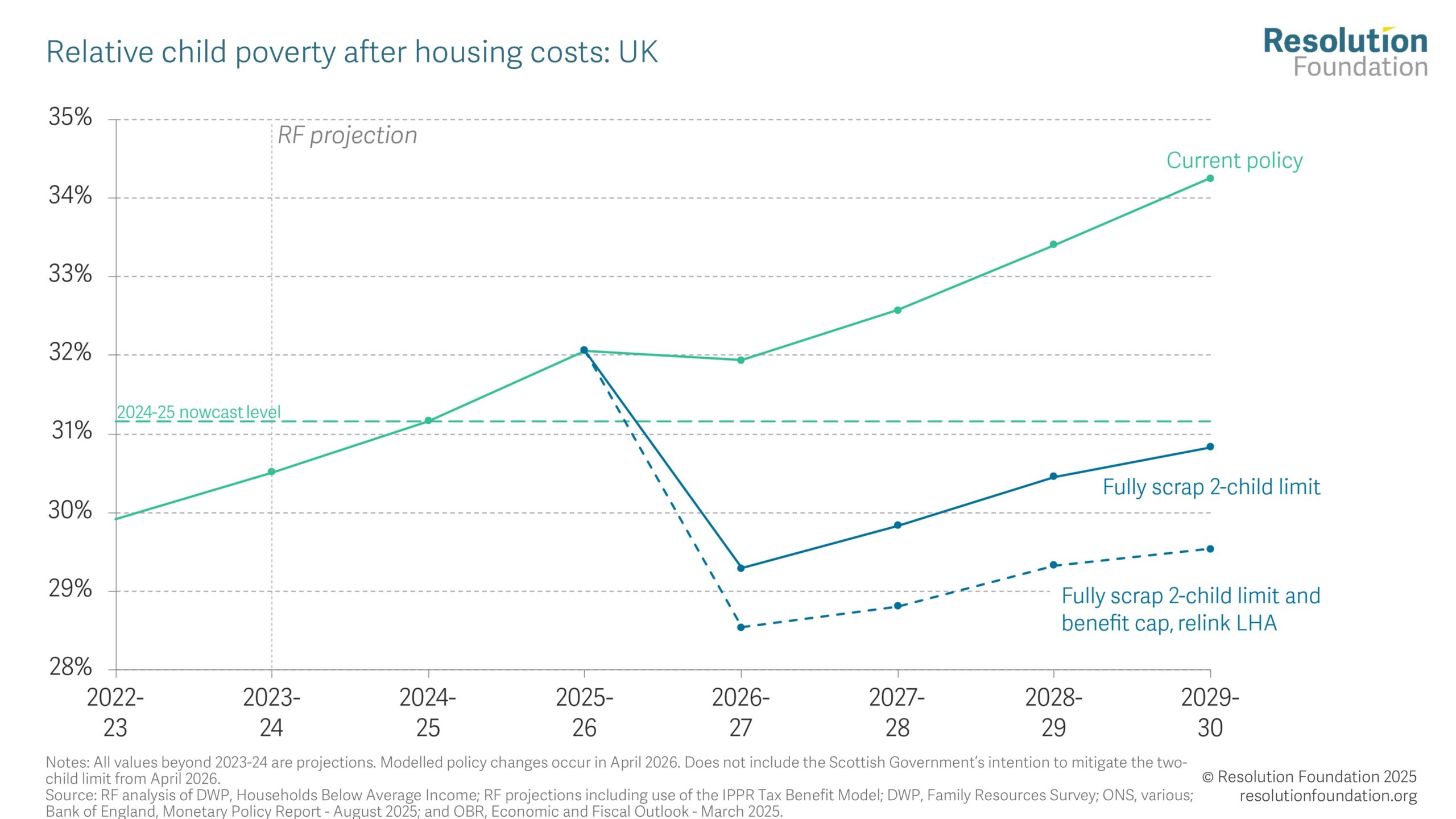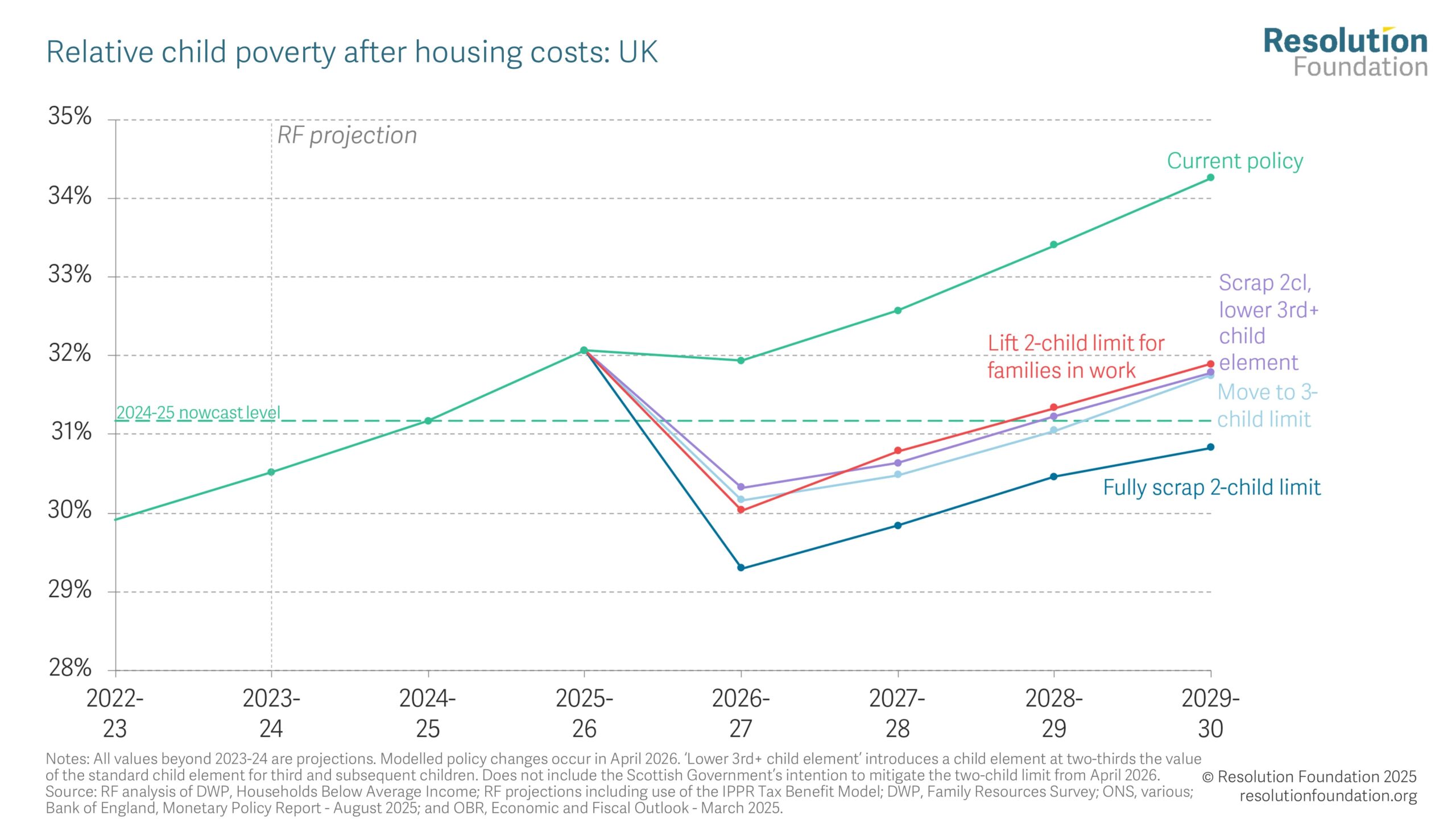Welfare No half measures Setting child poverty on a downward course at the Autumn Budget 30 October 2025 Alex Clegg Lindsay Judge The Government’s long-awaited Child Poverty Strategy is due next month, close to, or contemporaneous with, the Autumn Budget. There have been some welcome announcements already: the over-indexation of the Universal Credit (UC) standard allowance for the next four years, for example, and the extension of free school meals to all children in families on UC in England. But despite these actions, child poverty rates are still forecast to soar, from 31 per cent (4.5 million children) in 2024-25, to 34 per cent (4.8 million) by the end of 2029-30. Using the latest economic data, our modelling shows that if the Government wants child poverty to fall it has no choice but to place income support at the heart of an “ambitious” Child Poverty Strategy. There is simply no form of partial repeal of the two-child limit that would result in child poverty rates being lower in 2029-30 than they were in 2024-25. But in one fell swoop, the Government could reduce the number of children growing up in poverty by 330,000 today and save a further 150,000 children from that fate by 2029-30, if it were bold enough to scrap the two-child limit in full. Repealing the two-child limit at the Budget would be an unequivocal step in the right direction by the Government. However, even then, their ‘child poverty headroom’ – the gap between our projection for 2029-30 and the 2024-25 baseline – would still be slight (0.4 percentage points), leaving the Government at risk of not achieving any reduction in child poverty over the Parliament if economic conditions were to change. The wait is almost over: after more than a year of discussion and debate, the Government is expected to publish its Child Poverty Strategy next month, close to, or contemporaneous with, the Autumn Budget. The link to a fiscal event is important. Previous Resolution Foundation research has shown that even with optimistic assumptions about (higher) parental employment rates and (lower) housing costs in the future, child poverty is still set to remain on a stubbornly upward trajectory over the course of the Parliament. The unavoidable conclusion is that no Child Poverty Strategy will be credible unless it is accompanied by significant additional state support for family incomes. Without further action, child poverty will hit a historic high by the end of the Parliament The Government, of course, is far from oblivious to this reality, and has already announced policies to support lower-income families. In June’s Spending Review, for example, it announced that all children living in families in receipt of UC in England would be eligible for free-school meals (FSM) from September 2026, reducing the number of children in poverty by an estimated 50,000-100,000 by 2029-30. Added to this, at the Spring Statement, the Government committed to over-index the Universal Credit (UC) standard allowance for the next four fiscal years, confirming this in the Universal Credit Act 2025 in July. But at the same time it also said this would be accompanied by a large cut in the value of the Universal Credit health element for new claimants from April 2026, and current Universal Credit Health recipients will not benefit from the above-inflation rise in the standard allowance, offsetting any child poverty reduction effect as a result.[i] Figure 1: Under current policies, child poverty is set to reach record highs by 2029-30 However, as Figure 1 shows, welcome as they are, these policy changes do not radically shift the child poverty outlook over the forecast period.[ii] Using the latest economic data,[iii] we estimate that in 2024-25 (i.e. when the Government took power), relative child poverty measured on an after-housing costs (AHC) basis stood at 31 per cent, equivalent to 4.5 million children.[iv] Rates have likely risen since, and although the FSM extension in 2026-27 will act to push rates down that year, it is working against such a strong child poverty headwind that the effect is sadly short-lived. As a result, in the absence of further policy decisions to support lower-income families, we estimate that rates will hit 34 per cent in 2029-30, higher than observed at any time since 1961. Numerically, that would be equivalent to 4.8 million children in poverty (the relatively small increase in this number from 2024-25 reflects a declining child population in the UK over this period).[v] Partial repeal of the two-child limit is not what an “ambitious” strategy looks like As we have documented before, the most cost-effective policy choice to drive down rates of child poverty would be to scrap the two-child limit in its entirety.[vi] In one fell swoop, a decision by the Government to remove the limit would result in an estimated 480,000 fewer children growing in poverty in 2029-30 than the counterfactual, at a cost of £3.5 billion (or £7,280 per child lifted out of poverty). According to the Government’s own statistics, the majority (63 per cent) of households that would benefit from the repeal of the two-child limit have three children; over half (54 per cent) of those that would be affected are working households; and 40 per cent contain at least one adult or child with a health condition or disability. That result is clearly an attractive proposition for those who care about child poverty; the price tag far less so. Small wonder, then, that it is rumoured the Government has been exploring options for partial reform of the two-child limit, most notably lifting the limit for working families only; moving to a three-child limit which would restore benefit entitlement for third children but not for any fourth or subsequent child; and scrapping the limit in full but then paying the UC child element at a reduced rate for third and subsequent children. However, as Figure 2 shows, all of these partial-repeal alternatives would l