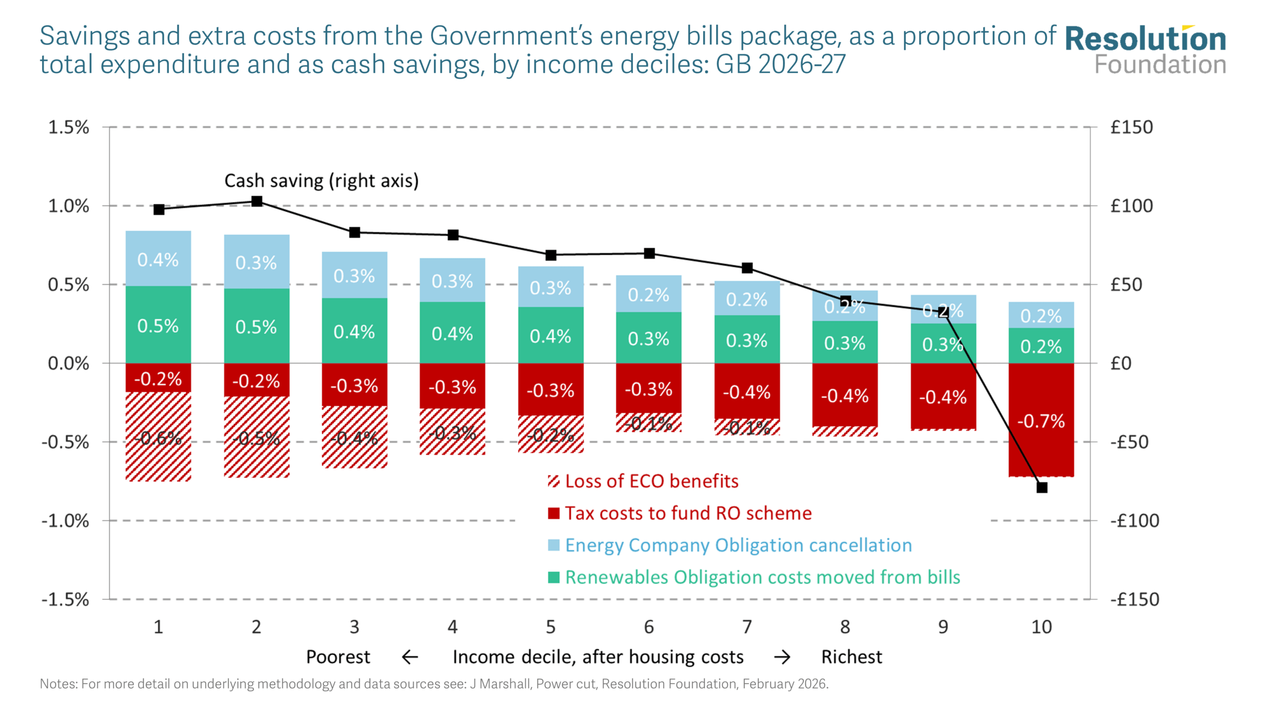 [i] These figures are for a household with an annual consumption of 2,700 kWh of electricity and 11,500 kWh of gas, values in line with Ofgem’s typical domestic consumption levels. The Government has explained that the £150 is a ‘rounded average figure’ and that the typical household uses less energy than this average. For more, see: Department for Energy Security and Net Zero, What does the Autumn Budget mean for your energy bills?, November 2025.