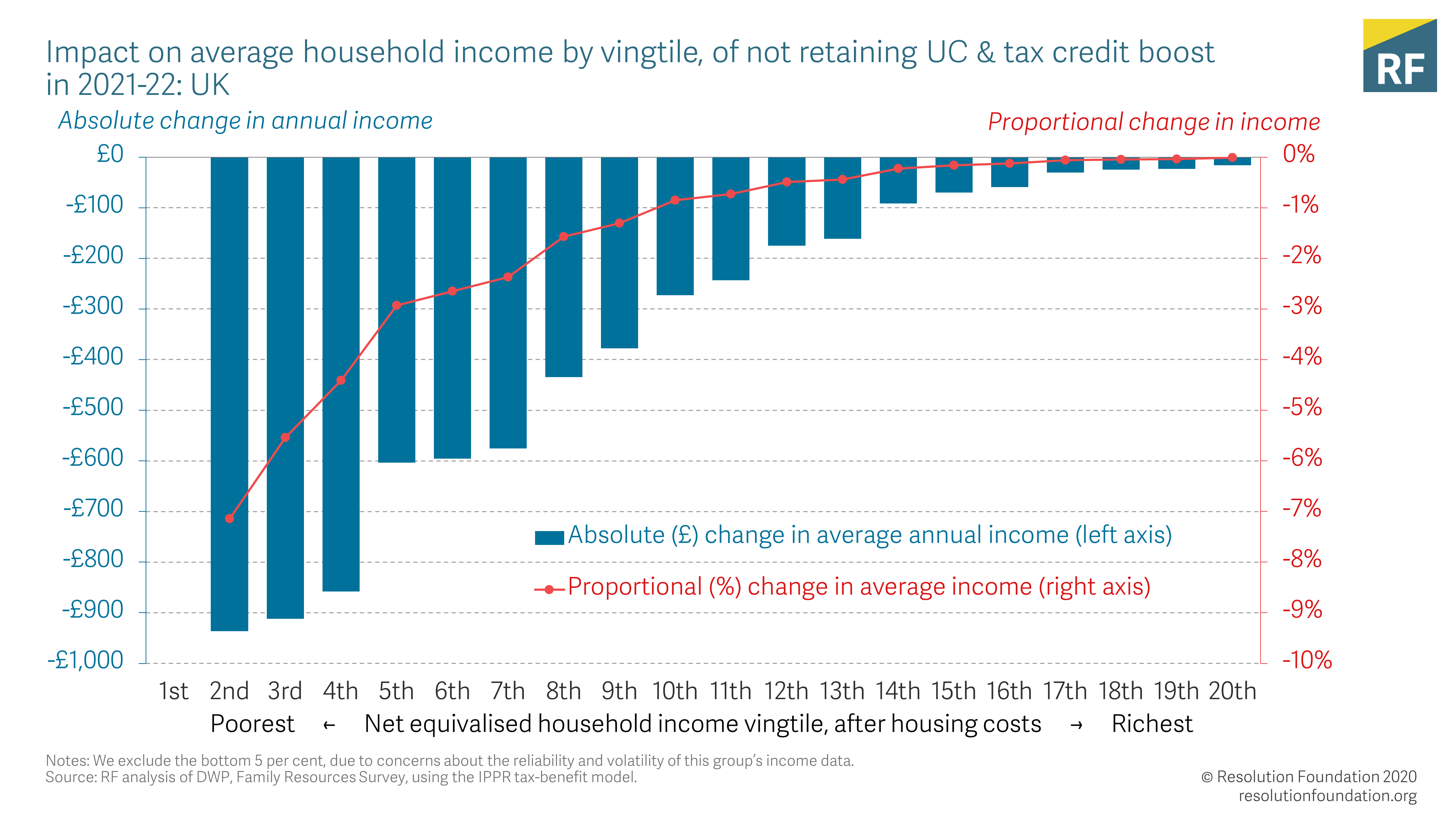 Covid-19· Welfare Safe harbour? Six key welfare policy decisions to navigate this winter 7 October 2020 Karl Handscomb Despite the new Job Support Scheme, unemployment is set to rise substantially through the autumn and winter, as the Job Retention Scheme ends and the hospitality sector adjusts to new restrictions. This means many more individuals will soon be dependent on the social security system; and as the economy moves into the next phase of this crisis, the Government has six key welfare decisions to make to help stop those who lost their jobs from being left behind. With the Job Retention Scheme (JRS) ending at the end of this month, and tougher restrictions affecting hospitality newly in place, we face an autumn and winter of rising unemployment, despite the new Job Support Scheme. Over five million families – around a quarter of all working age households – are currently claiming either Universal Credit (UC) or Working Tax Credit (WTC), and this number will surely grow. With the uncertainty around the virus and the economy continuing, the chances of the newly-unemployed being able to find new work remain low, and so the social security system will be key to supporting these families and preventing undue hardship. The Chancellor was aware of this in March: “So we will also act to protect you if the worst happens…I’m announcing nearly £7bn of extra support through the welfare system to strengthen the safety net and protect people’s incomes.” And this support is still important today. To keep on protecting families, the Government has six key welfare decisions to make in the forthcoming weeks to help ensure the social security system can probably protect families in this ongoing in the next phase of this crisis. 1. The poorest households are set to lose £1,000 of their annual income next April Recognising the increasing reliance on benefits during the pandemic, the Government announced in March a temporary increase to UC and WTC of around £20 per week during 2020-21 – the majority of the £7bn cost of all the extra support. As Figure 1 shows (taken from our Living Standards Audit), this increase helped to offset – at least on average – the initial fall in incomes caused by the labour market effects of the virus for the lowest-income households. Now, the Government risks undoing this protection for the poorest families at a time when they need it most. Figure 1: The benefit increases protected the poorest families from the largest income shock in the crisis Figure 2: Discontinuing the £20 a week increase will leave the poorest families 7 per cent worse off net year This benefits increase, costing £7 billion this year, is an expensive policy. But the case for continuing with it is very strong. The cut to UC this coming April will see over six million families worse off by £1,000 per year – that is almost twice the number of families that would have been affected by the, eventually reversed, tax credit cuts planned for 2016. Figure 2 shows our current forecast that poorest families will suffer a huge 7 per cent fall in income if the £20 per week increase is removed in April. 2. The Benefit Cap means that 124,000 families on UC did not receive the full £20 per week benefits increase earlier this year, and thousands more are likely to see a fall in their benefit as the grace period runs out Although the standard allowance for UC increased in April, there was no increase in the Benefit Cap. This limits the total benefits that most families can receive to £20,000 per year (£23,000 in London), and most single adults to £13,400 per year (£15,410 in London). This means that families with high housing costs, typically families with children, did not see their income from benefits rise in April. This is reflected in the latest data for May 2020 which shows that 7 per cent of UC claims with children in receipt of payment are subject to the benefit cap, compared to less than 1 per cent of UC claims without children. Figure 1 shows how the 124,000 Universal Claims subject to the Benefit Cap in August – 65,000 more than in March – are distributed by region across the UK, highlighting the concentration of capped families in London, reflecting the higher housing costs. Figure 3: The Benefit Cap is affecting nearly double the number of households since the crisis started But there are some important exemptions from the Benefit Cap, reflecting the intention that it should not penalise those who are in work, or cannot work due to health conditions. Crucially, there has always been a grace period of nine months for those who were in work before they had to claim UC (claimants had to have consistently met the earnings threshold for twelve months before having stopped working). The principle is to avoid penalising those who until recently have been in work, but then encouraging them back into work as the grace period ends and the benefit cap binds. November will mark nine months since the start of this crisis, and so this is when the Benefit Cap will kick in for those families who claimed UC when the crisis began. But ending the grace period is clearly at odds with the current economic climate. For an example single parent in a high housing cost area, not qualifying for the grace period could be the difference in benefit of £57 per week – or a quarter of their income after housing costs. To better support families who have lost income during the crisis and have not yet had the opportunity to go back to work, the Government should extend the grace period for the Benefit Cap. It should also consider the level of the cap and the reasonableness of the policy – especially for younger claimants – during the ongoing crisis. Taking an example single parent aged 21, with two young children, privately renting a two-bedroom property in Reading at the 30th percentile of local rents (£219 per week). They would currently be entitled to an underlying UC award equal to £40