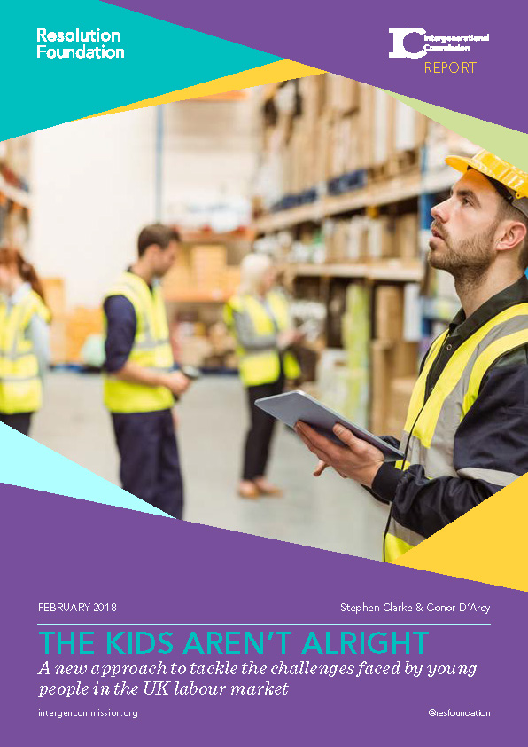 Labour market· Intergenerational Centre The kids aren’t alright: a new approach to tackle the challenges faced by young people in the UK labour market 26 February 2018 Stephen Clarke Conor D’Arcy The Resolution Foundation’s Intergenerational Commission has analysed the breakdown of generational progress in a number of domains, including housing, the welfare state and the labour market. In terms of the latter we have outlined how the assumption that each generation will earn more than the one before it no longer appears to hold. This paper moves beyond the diagnosis of these problems to consider what action is needed to address the challenges facing millennials. Here we focus on the labour market and outline a fundamentally new approach: an active labour market policy to confront the challenges of the 21st, not the 20th century. In particular this means a new focus on the security of, and opportunities within, work for young people, rather than a narrow focus on youth unemployment. Typical weekly earnings for millennials who have turned 30 are currently £470, £15 less than that of generation X when they turned 30 between the years of 1996 and 2010. This represents an unprecedented break with the past and three main factors have driven this change. The first is the rise of atypical, insecure, work, the second is that a greater share of younger people are working in lower paying sectors, and the third is that fewer younger workers are moving jobs, and moving up the career ladder, than previous generations. It will be years before we can fully understand how deep the labour market scars are from millennials spending long periods in insecure and low paid work. This report argues that simply assuming that these problems will disappear would be a dangerous mistake, therefore we outline what action needs to be taken now.