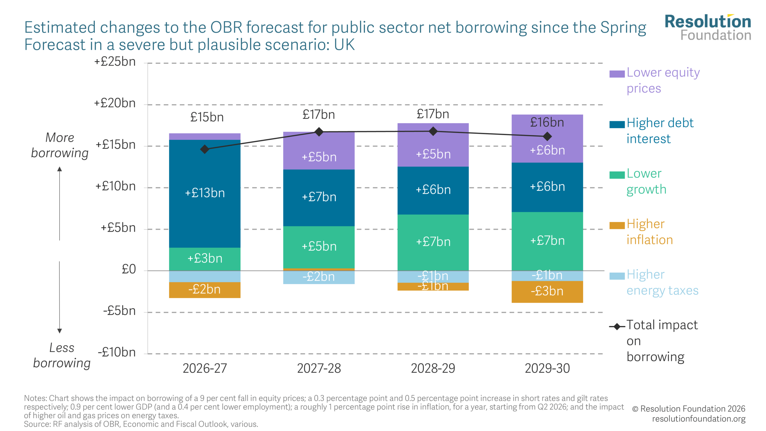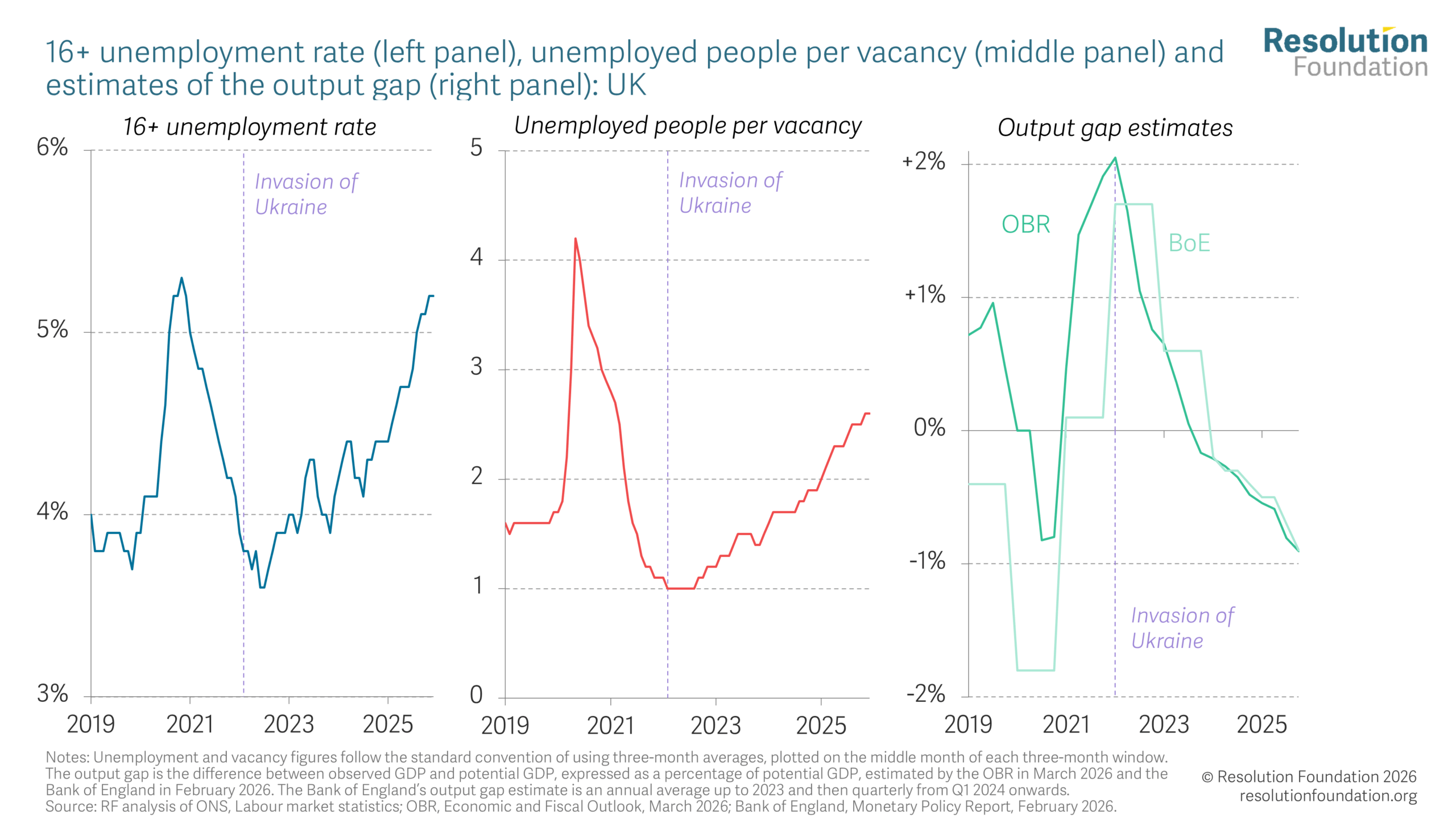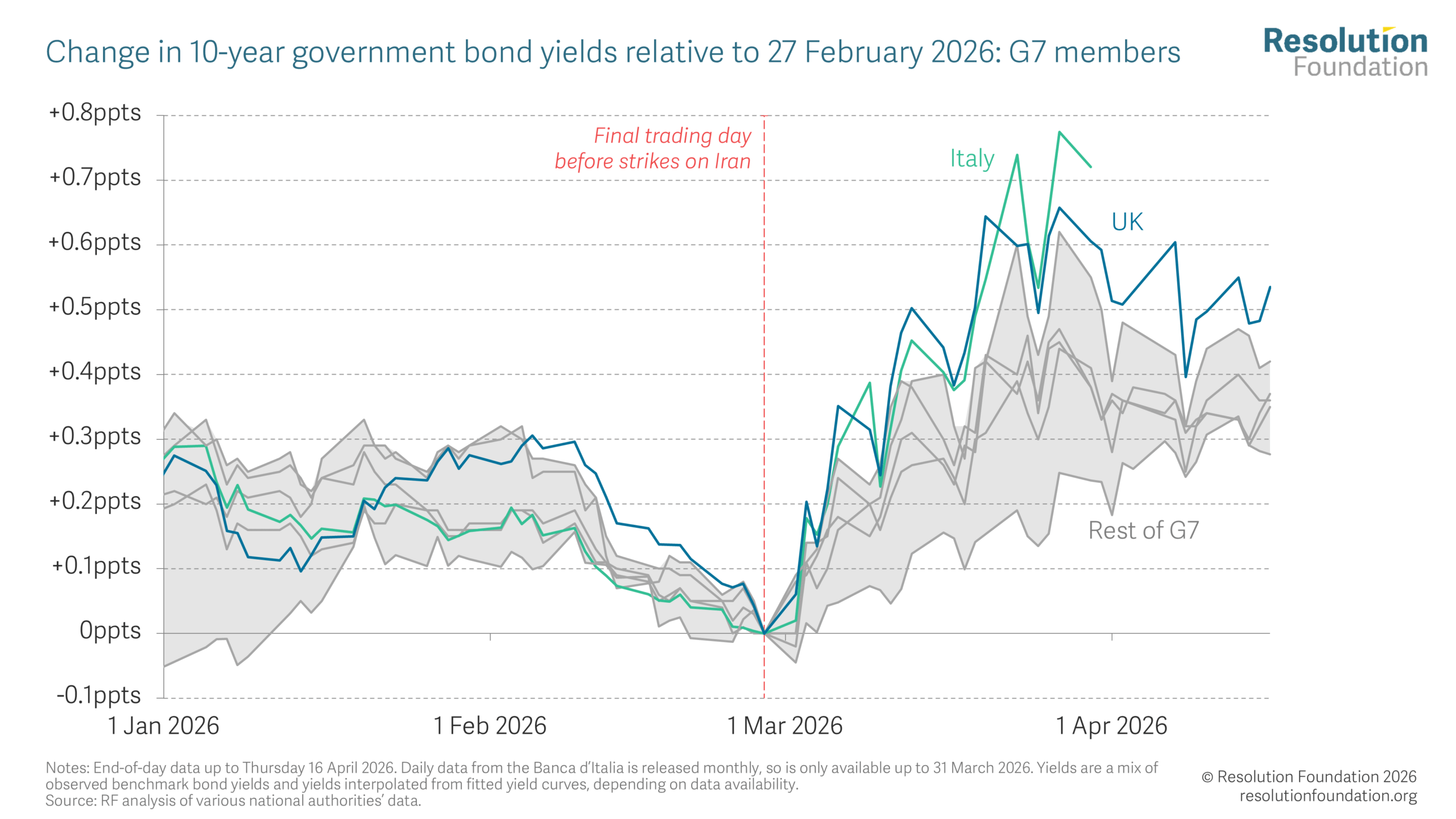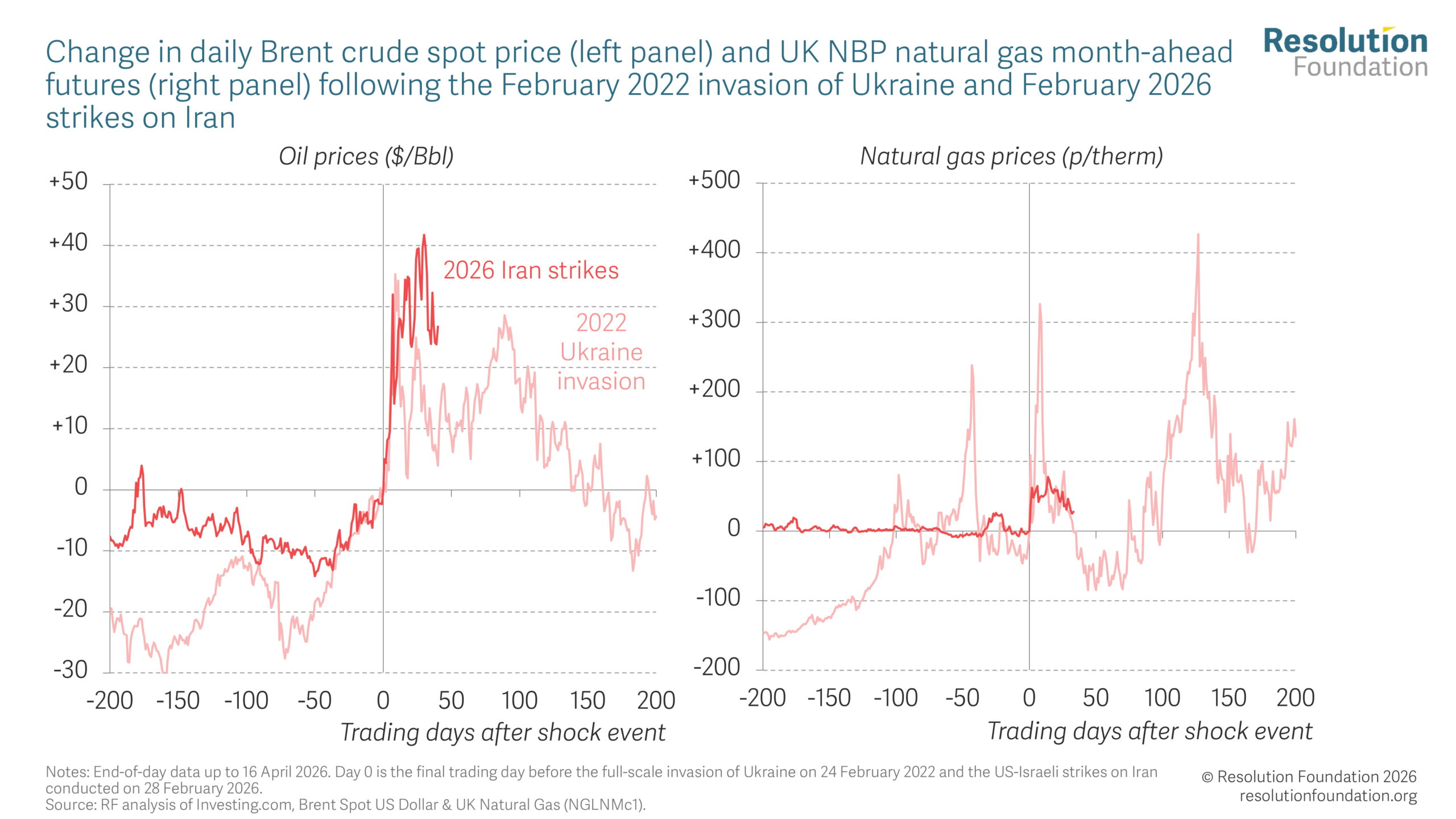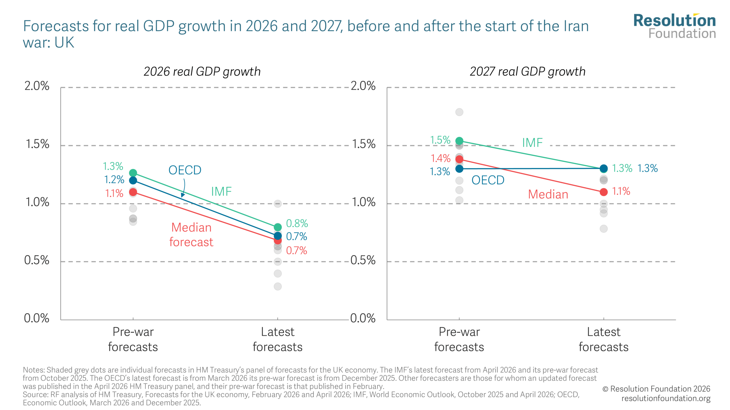 Monetary policy· Fiscal policy· Macroeconomic policy The Macroeconomic Policy Outlook Q2 2026 22 April 2026 Simon Pittaway James Smith Greg Thwaites Since the US-Israeli strikes on Iran began nearly two months ago, global energy markets have been volatile. But the shock facing Britain has so far been smaller than that which followed Russia’s invasion of Ukraine: UK gas prices peaked at 78p per therm above pre-war levels – not 300p, as in 2022. Even so, a return to recent peaks would hit family finances hard: British households’ energy and fuel spending this year would be £11 billion higher than if prices had stayed at early-2026 levels. In light of ongoing uncertainty over developments in the Middle East, this edition of the MPO unpacks the potential impact of the shock on the UK economy, and discusses how the Bank of England and Government should respond. In recent weeks, the IMF and OECD both marked down the UK’s 2026 growth rate by 0.5 percentage points – the largest downgrades of any rich country. Although UK GDP is about half as energy intensive as the global average, two features set Britain apart from its peers. First, British households are unusually exposed to gas prices. Gas accounts for 62 per cent of final household energy consumption – by far the highest share in the G7 – and our electricity prices are closely tied to wholesale gas. Second, UK interest rates are particularly exposed. In March 2026, UK 10-year yields rose by more than those in any other G7 country bar Italy, reflecting sticky UK inflation and stretched public finances. This pushed up mortgage rates by a percentage point, costing around an extra £100 a month for a typical first-time buyer re-fixing in March rather than February. The big question for the Bank of England is how aggressive to be in anticipating second-round inflation effects. The case for a forceful response is strengthened by the fact that the UK has had only one month of below-target inflation in nearly five years, and by the perception that the Bank was slow to act after Russia’s invasion of Ukraine. But our view is that the Bank should be more cautious. This is not 2022: the shock is smaller, there is more slack in the economy, and before the war the Bank was forecasting rising unemployment and at-target inflation from June. On the fiscal side, the Government should cushion families from the shock – but support needs to be timely, targeted and temporary, not a repeat of the blanket Energy Price Guarantee. Universal support would be expensive and, if unfunded, could push up interest rates. Targeted energy bill discounts are the better route. The harder question is how to pay for that support amidst a worse economic outlook. In a severe but plausible downside scenario we estimate borrowing would increase by £16 billion in 2029-30. This would leave the Government still meeting its fiscal rules thanks to the additional headroom in last year’s Budget, albeit wiping out most of that headroom. It would be a mistake to suspend or change the fiscal rules given the size of the shock, the UK’s lack of fiscal space, and clear evidence of higher borrowing costs. Instead, the Government should continue to commit to live within its rules, demonstrate its willingness to deliver consolidation, and keep cost of living support credibly temporary and targeted. Sustained conflict in the Middle East could deliver an £11 billion hit to UK family finances In early 2026, the Iran War delivered a double blow to the global supply of oil, gas and other hydrocarbons. Drilling and refining infrastructure has been destroyed or taken offline, and the effective closure of the Strait of Hormuz disrupted transport from the Persian Gulf to the rest of the world. As things stand, the near-term future of trade in the Middle East is highly uncertain. While oil and gas prices have receded from recent peaks amid hopes of deescalation, they remain above pre-war levels, and the risk of sustained conflict cannot be ignored. In this edition of the MPO, we examine the potential impact of these developments on the UK economy and discuss how policy makers at the Bank of England and the Government should respond. The surge in global energy prices echoes the market reaction to Russia’s full-scale invasion of Ukraine in February 2022. But the magnitude of the shock to natural gas is very different. As Figure 1 shows, UK natural gas prices rose by 78p per therm in March 2026 before falling back, compared to a spike of more than 300p per therm in March 2022. Recent oil price moves have, by contrast, been similar in size to those in 2022. At its peak in April 2026, a barrel of crude cost $42 more than the day before the Iran war began (a 57 per cent increase), compared to a peak increase of $35 per barrel in 2022 (a 36 per cent increase).[1] Figure 1: Less oil and gas is being supplied to the world, so prices have spiked The direct impact on British families will come through higher energy prices. In March and early April, forecasts for the July 2026 energy price cap rose to £1,973 for a typical household – 20 per cent above its April level. Average weekly petrol prices also rose 20 per cent above their pre-war levels, while diesel prices jumped by 36 per cent. The outlook for fuel and energy prices remains uncertain. But a sustained return to these peaks would see British households spending an extra £11 billion on fuel and energy in 2026 than if prices had remained at early-2026 levels (assuming no real-terms consumption cuts) – a hit equivalent to 0.5 per cent of aggregate household income.[2] While this would place real financial pressure on family finances, it’s less than half the increase in fuel and energy spending seen between 2021 and 2022 (1.3 per cent of household income) – which occurred despite the introduction of the Energy Price Guarantee and families cutting back on energy use. Higher bills are the most visible channel through which the Ira